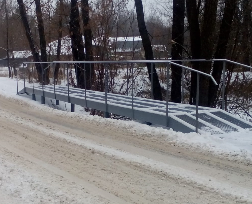 Для удобства жителей подрядчик установил на сваи металлическое пешеходное основание и перила. Кроме того, мост был приподнят над проезжей частью для безопасности пешеходов.