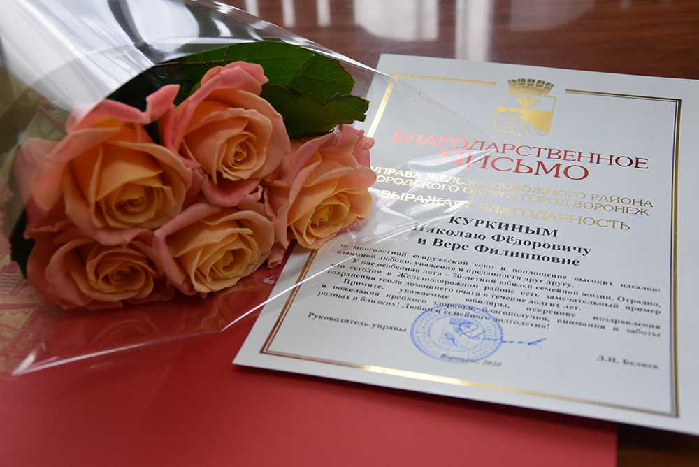 Руководитель управы Железнодорожного района Леонид Беляев поздравил с 70-летним юбилеем семейной жизни супругов Куркиных – Николая Федоровича и Веру Филипповну.От его имени паре вручили благодарственное письмо, цветы и фотоальбом.