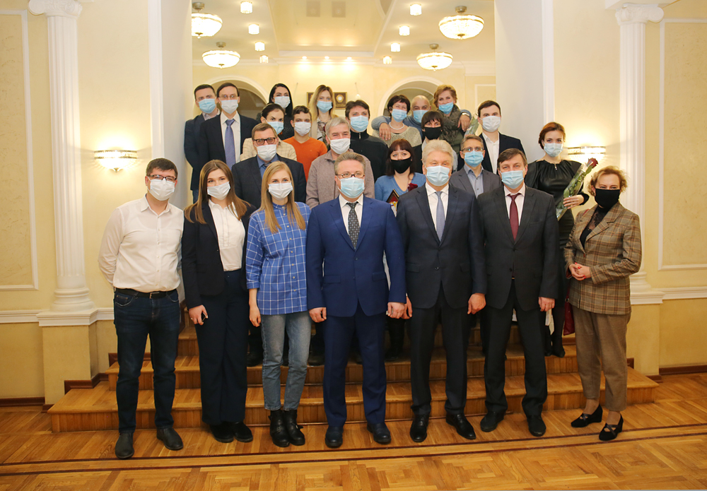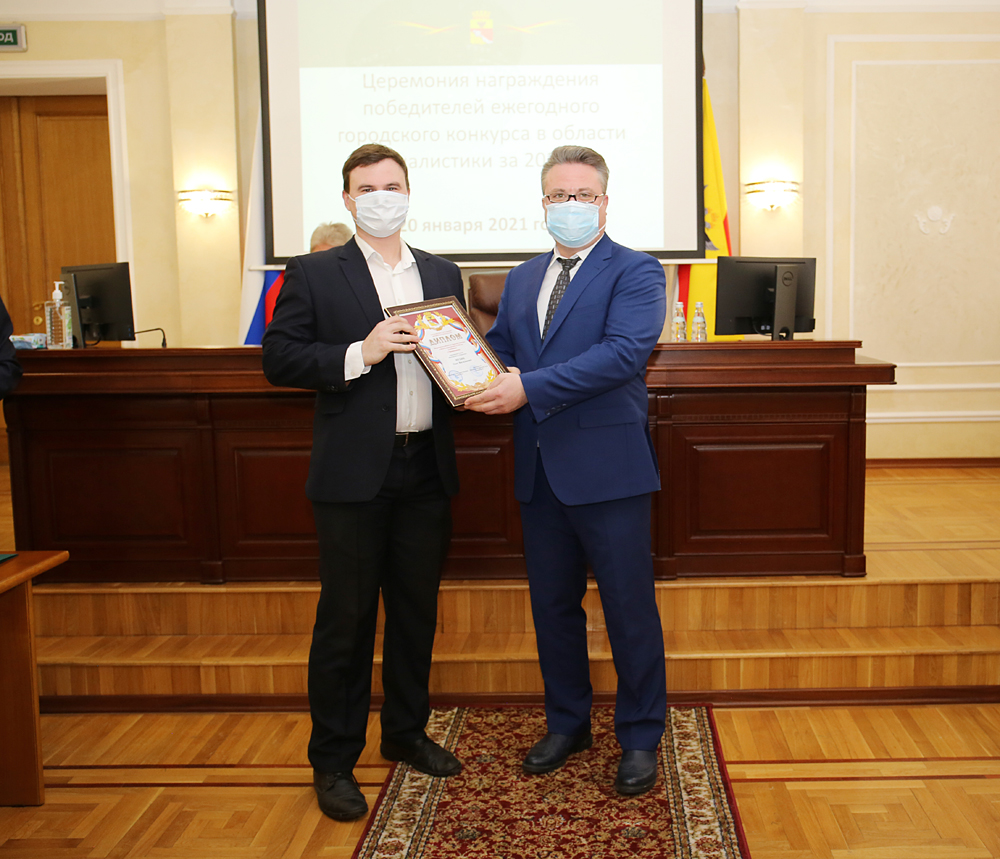 В большом зале администрации города состоялась ежегодная церемония награждения победителей конкурса в области журналистики за 2020 год.Дипломы лауреатов, награды мэрии и Воронежской городской Думы с соблюдением мер санитарной безопасности вручили глава городского округа город Воронеж Вадим Кстенин и председатель Воронежской городской Думы Владимир Ходырев.