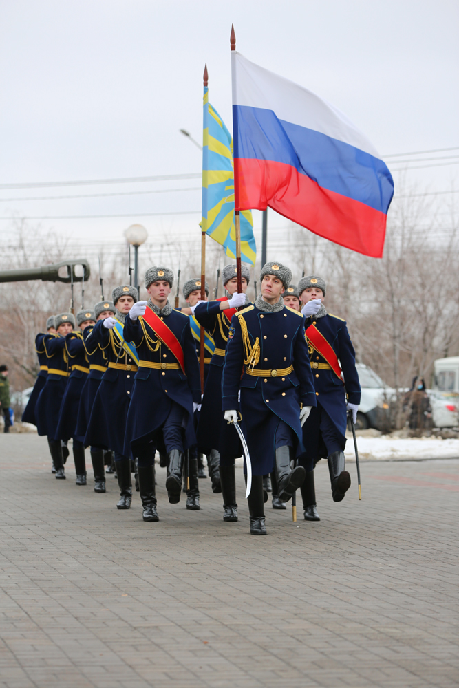 В завершении церемонии оркестр исполнил гимн Российской Федерации, а почетный караул прошел торжественным маршем.