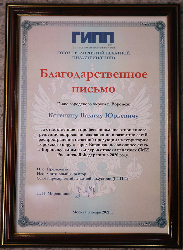 За ответственное и профессиональное отношение к решению вопросов по сохранению и развитию сетей распространения печатной продукции на территории городского округа, позволившее стать ему одним из лидеров отрасли печатных СМИ Российской Федерации в 2020 году, глава Воронежа Вадим Кстенин был отмечен благодарственным письмом Союза предприятий печатной индустрии (ГИИП).– Мы понимаем высокую значимость печатных средств массовой информации, ту ответственность, которая на них лежит, сложности, которые могут возникать с распространением печатных изданий. В рамках своих полномочий муниципалитет старается создать для организаций, осуществляющих продажу печатных изданий, условия, которые позволят сохранять и развивать этот социально значимый бизнес, – подчеркнул градоначальник.Так, к примеру, организациям, реализующим печатную продукцию, неоднократно предоставлялась льгота в виде освобождения от платежей (или их части) за право на заключение договоров на размещение нестационарных торговых объектов, что позволило снизить финансовую нагрузку и увеличить оборот торговли печатной продукции.