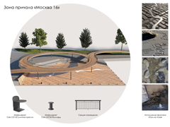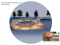 Зону причала «Москва 16» предлагается выполнить в виде двухуровневого деревянного навеса с фонтаном в виде пути на Азов.