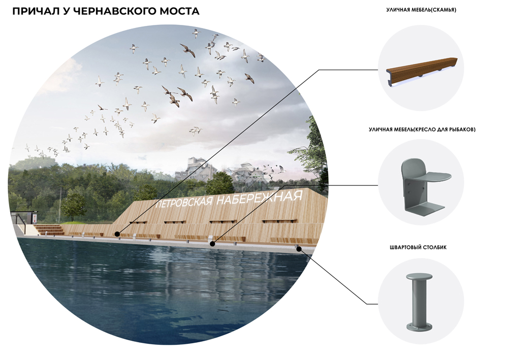 Главный архитектор проекта Екатерина Белоус представила схему планирования проектируемого участка набережной и уже проработанную визуализацию части объектов.Основной акцент сделан на зоны променада, так как проектируемая территория – привычная всем прогулочная площадка у воды. Пешеходные дорожки могут быть оснащены оригинальными малыми архитектурными формами (скамейками с высокими спинками), ограждением с подсветкой, а утраченные элементы ограждения можно заменить светопрозрачными.