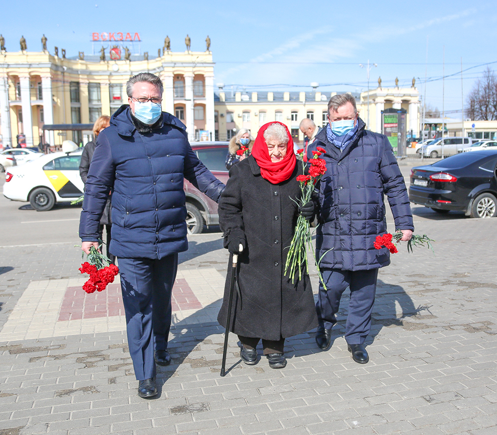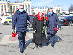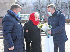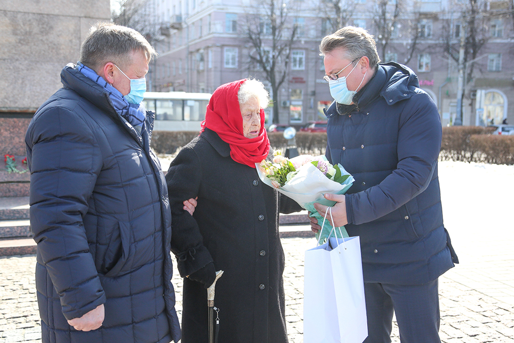 Глава города вместе с защитницей Воронежа, участницей Великой Отечественной войны Марией Денисовной Колтаковой возложили цветы к памятнику И.Д. Черняховскому. Мария Денисовна специально приехала из Белгорода, чтобы почтить память полководца, из рук которого получала свою первую боевую награду – медаль «За отвагу».