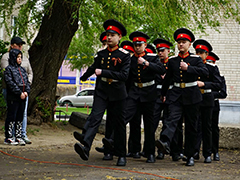 В мини-параде приняли участие кадеты Михайловского кадетского корпуса. Они маршировали под аккомпанемент Военного оркестра Управления Росгвардии по Воронежской области.