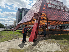 В Коминтерновском районе сотрудники комбината благоустройства провели косметический ремонт пирамиды, расположенной на пересечении Московского проспекта и улицы Хользунова.
