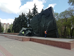 Сотрудники комбината благоустройства, с использованием спец. техники и моющих средств отмыли монумент и мраморные плиты. Кроме того, были помыты памятник генералу Александру Лизюкову и семи неизвестным солдатам.