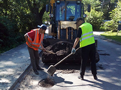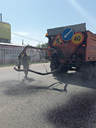 В рамках временной меры по ремонту дорожного покрытия по улицам Белорусской, Уразовской и Артамонова проводилась засыпка и планировка ям срезом асфальтобетона.