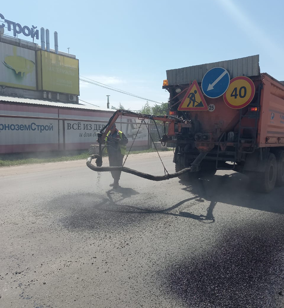 В рамках временной меры по ремонту дорожного покрытия по улицам Белорусской, Уразовской и Артамонова проводилась засыпка и планировка ям срезом асфальтобетона.