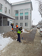 На особом контроле остаются подходы к объектам здравоохранения. Труднодоступные для спецтехники территории около поликлиник очищаются от снега и льда вручную.