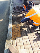 С наступлением тепла, используя благоприятные погодные условия, сотрудники комбината благоустройства выполняют фрагментарный ремонт плиточного мощения тротуаров. Это происходит в местах, где с течением времени отдельные элементы покрытия сильно изнашиваются и требуют замены.