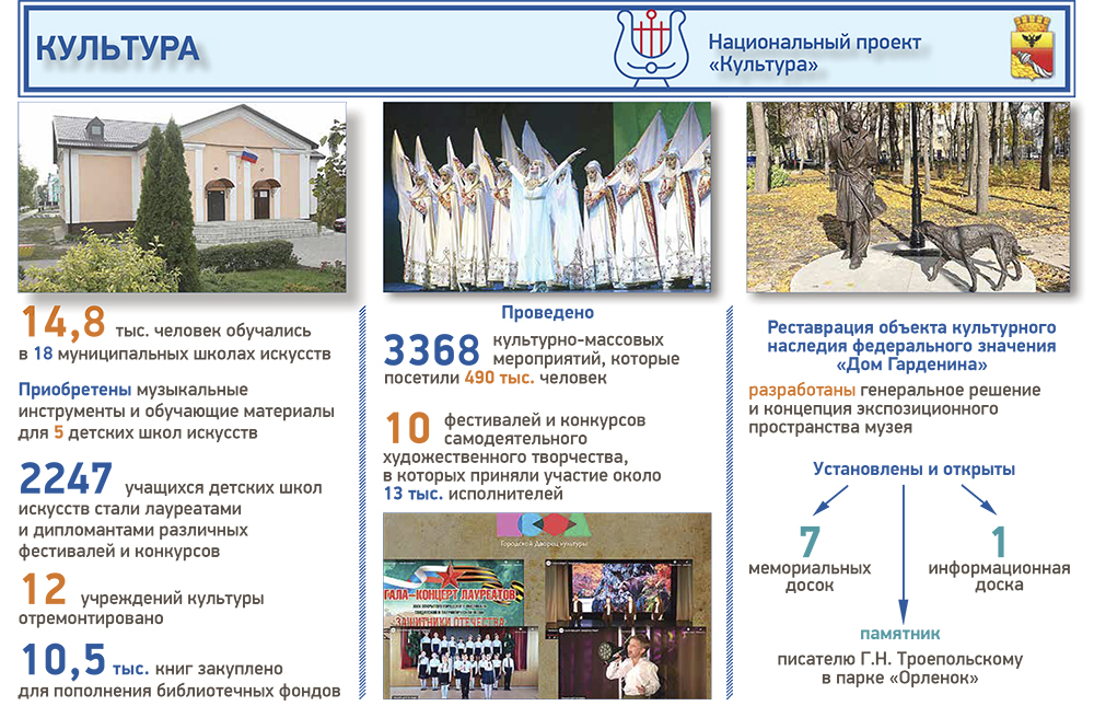 В культуре Воронежа в прошедшем году тоже произошло немало значимых позитивных изменений.– Мы приступили к восстановлению объекта культурного наследия федерального значения «Дом Гарденина». Выполнены подготовительные работы по реставрации музея, разработана научная концепция экспозиционного пространства. Надеюсь, «Дом Гарденина» займет весомое место в списке туристических объектов Воронежа, – поделился глава Воронежа.Противоэпидемические ограничения не только не остановили культурную жизнь города, но и дали толчок развитию ее нового направления – в режиме онлайн. Так, достигнуто рекордное значение обращений удалённых пользователей библиотек (около 82 тыс. человек). В целом, проведено более 3 тысяч культурно-массовых мероприятий (в том числе дистанционных), которые посетили 490 тыс. человек.
