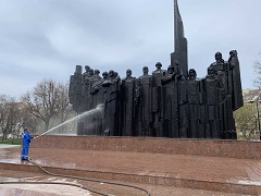 - С понедельника комбинат благоустройства района уже приступил к влажной уборке городских памятников. Но не все памятники мы можем привести в порядок своими силами, поэтому прибегаем к помощи специалистов РВК-Воронеж, которые традиционно производят очистку самых высоких памятников района – отметил исполняющий обязанности руководителя управы Центрального района Игорь Галкин.Так, по традиции специалисты «РВК-Воронеж», с помощью поливомоечной машины и моющих средств, привели в порядок 10 метровый памятник Алексею Кольцову, расположенный на улице Кольцовской и Монумент на площади Победы, изображающий двенадцать фигур, представляющих солдат всех родов войск Советской армии, народных ополченцев и партизан.