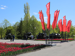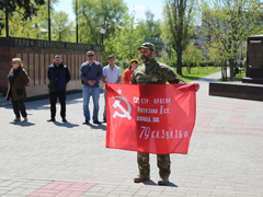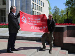 В Воронеж для скульптуры "Бабушки с красным флагом" с Донбасса прибыло "Знамя Победы"