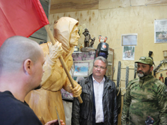 Далее глава Воронежа, скульптор и советник главы ДНР отправились в мастерскую, где уже завершена работа над самой скульптурой и символом Родины-матери, который будет ее дополнять. Игорь Кимаковский очень хотел не только передать знамя, но и своими глазами увидеть воплощение "Бабушки с красным флагом" в дереве.Александр Ивченко рассказал гостям о том, как родилась идея увековечить символ, как шла работа над ним. И главное - провел примерку знамени.