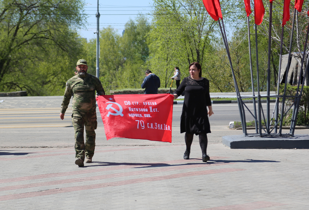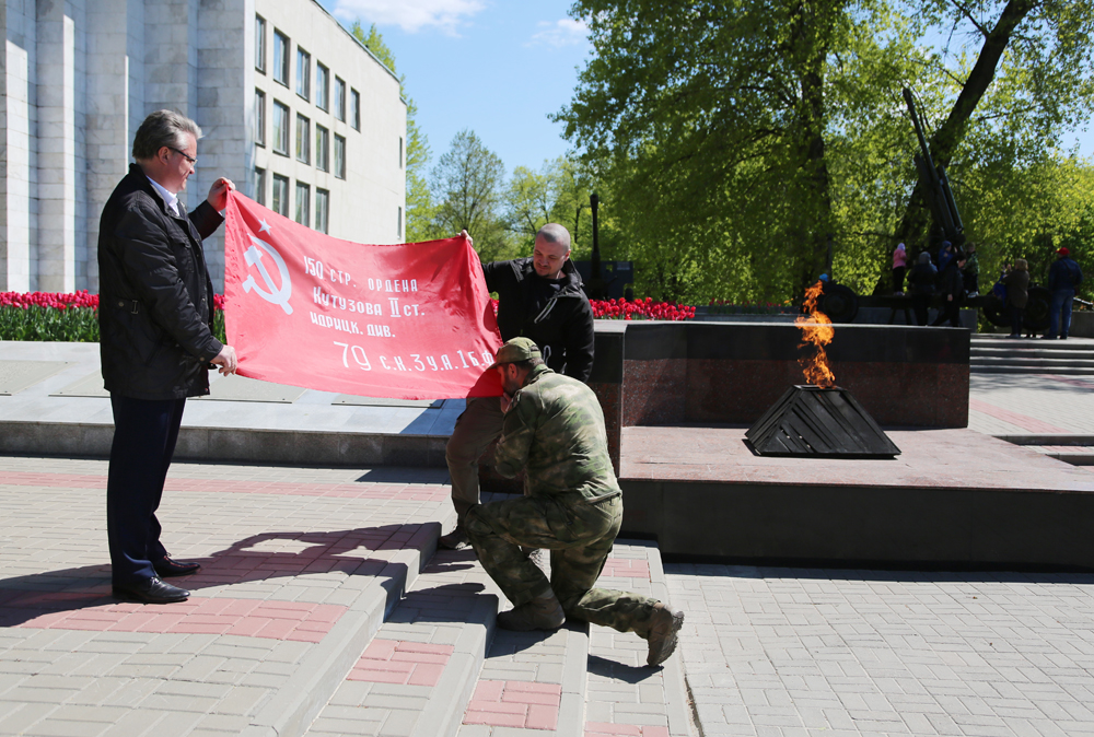 В Воронеж для скульптуры "Бабушки с красным флагом" с Донбасса прибыло "Знамя Победы"