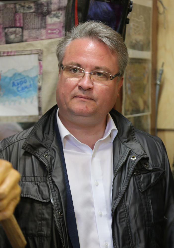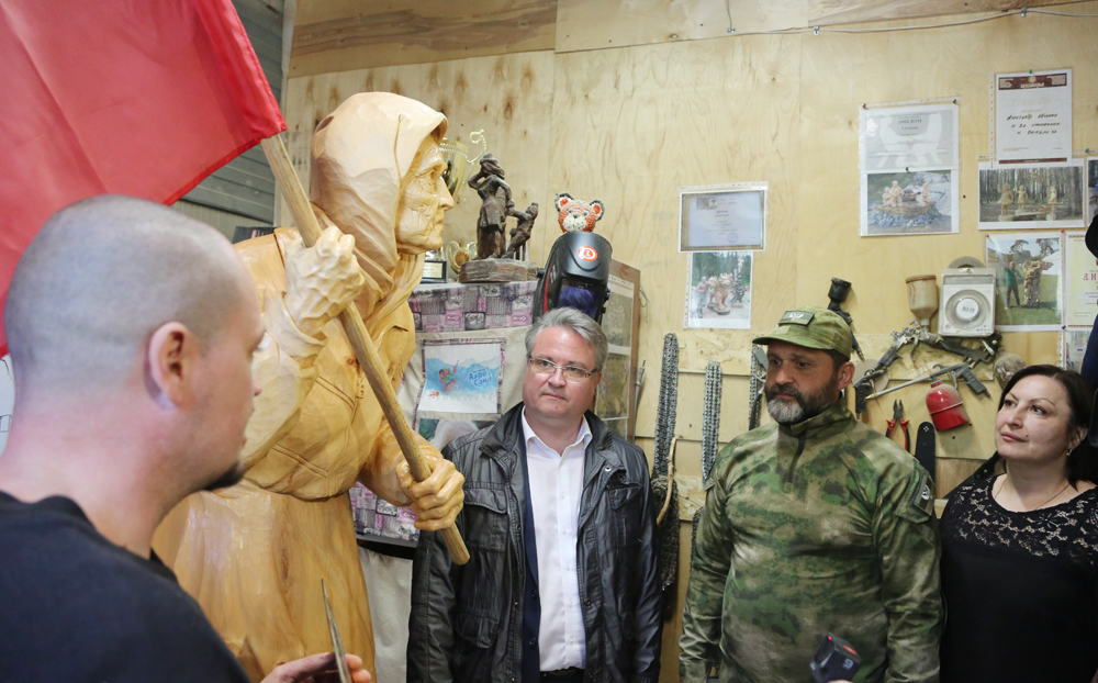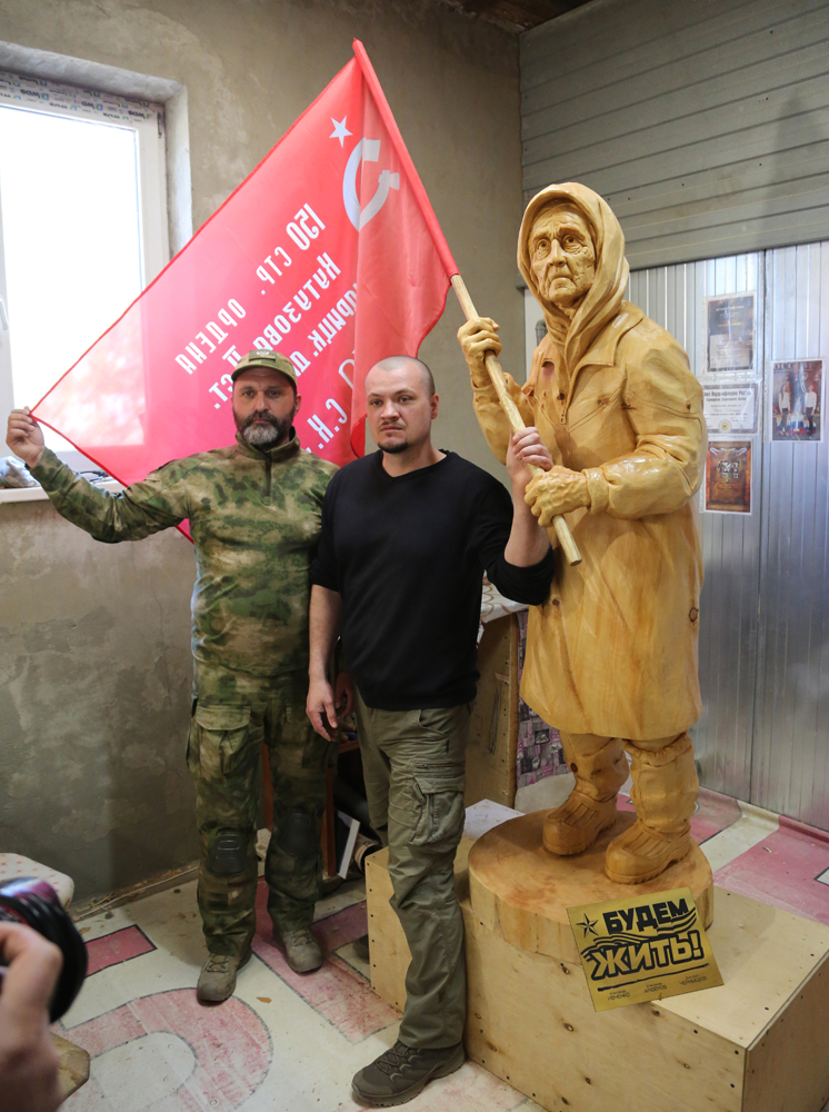 Далее глава Воронежа, скульптор и советник главы ДНР отправились в мастерскую, где уже завершена работа над самой скульптурой и символом Родины-матери, который будет ее дополнять. Игорь Кимаковский очень хотел не только передать знамя, но и своими глазами увидеть воплощение "Бабушки с красным флагом" в дереве.Александр Ивченко рассказал гостям о том, как родилась идея увековечить символ, как шла работа над ним. И главное - провел примерку знамени.