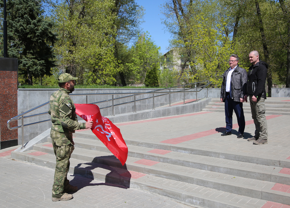 Красное знамя для скульптуры "Бабушки с красным флагом" в Воронеж привез советник главы ДНР Игорь Кимаковский. После многочасового пути он прибыл в знаковое место - к вечному огню у Центра военно-патриотического воспитания "Музей-диорама". Здесь установлена стела "Воронеж - Город воинской славы", здесь - в здании музея - скульптура "Бабушки с красным флагом" будет установлена на постоянной основе после торжественной церемонии открытия, которая пройдет в Воронеже в День Победы. Вместе с советником главы ДНР в Воронеж приехала Ольга Агранович – вдова Сергея Аграновича (позывной «Водяной»), командира разведроты «Спарты», гвардии майора, погибшего при выполнении боевой задачи. Ольгу Михайловну многое связывает с нашим городом. Игорь Кимаковский, передавая флаг главе города и Александру Ивченко, рассказал о чувствах, с которыми он принимал его на Донбассе, о той ответственности, с которой он выполнял эту миссию.