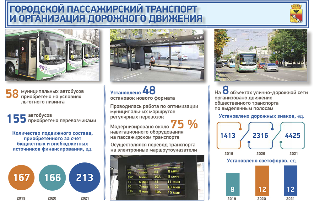 – В 2021 году для «Воронежпассажиртранса» на условиях льготного лизинга к ранее закупленным 62-м было получено еще 58 автобусов ЛиАЗ, работающих на газомоторном топливе. Все приобретенные автобусы полностью отвечают требованиям современной городской среды и оборудованы для маломобильных граждан. Но на этом не остановились. В текущем году на приобретение автобусов выделено более 1 млрд. рублей, – отметил глава города.Что касается частных перевозчиков – несмотря на непростые условия, ими было приобретено 155 автобусов на сумму 660 млн рублей. Кроме обновления подвижного состава, продолжалась и модернизация остановочных комплексов – совместно с предпринимателями было установлено 48 современных павильонов нового формата.