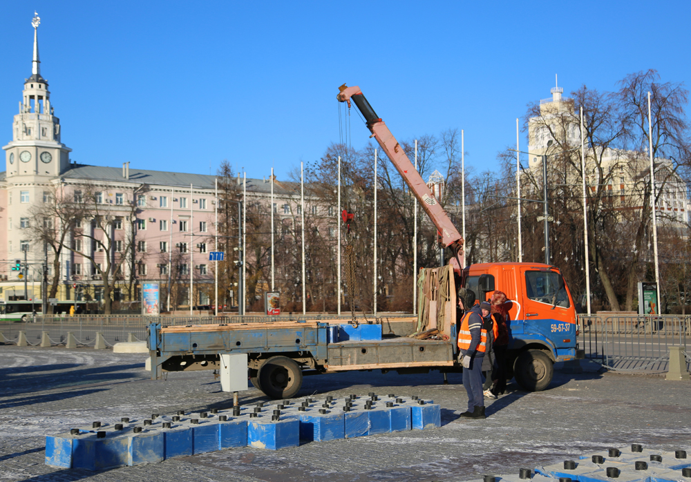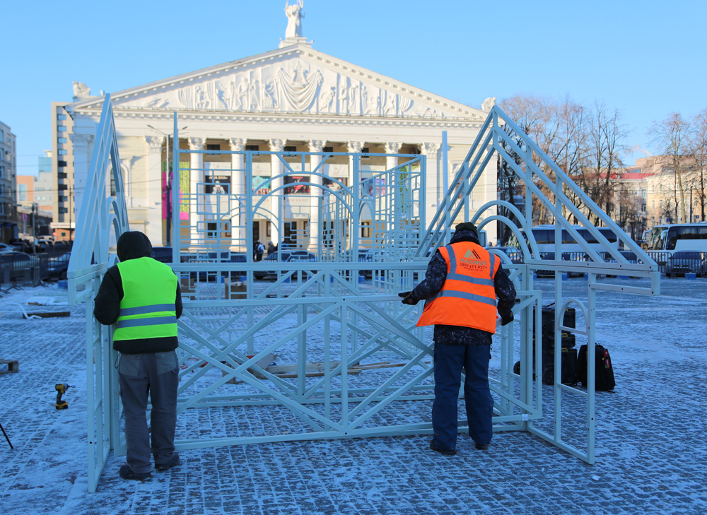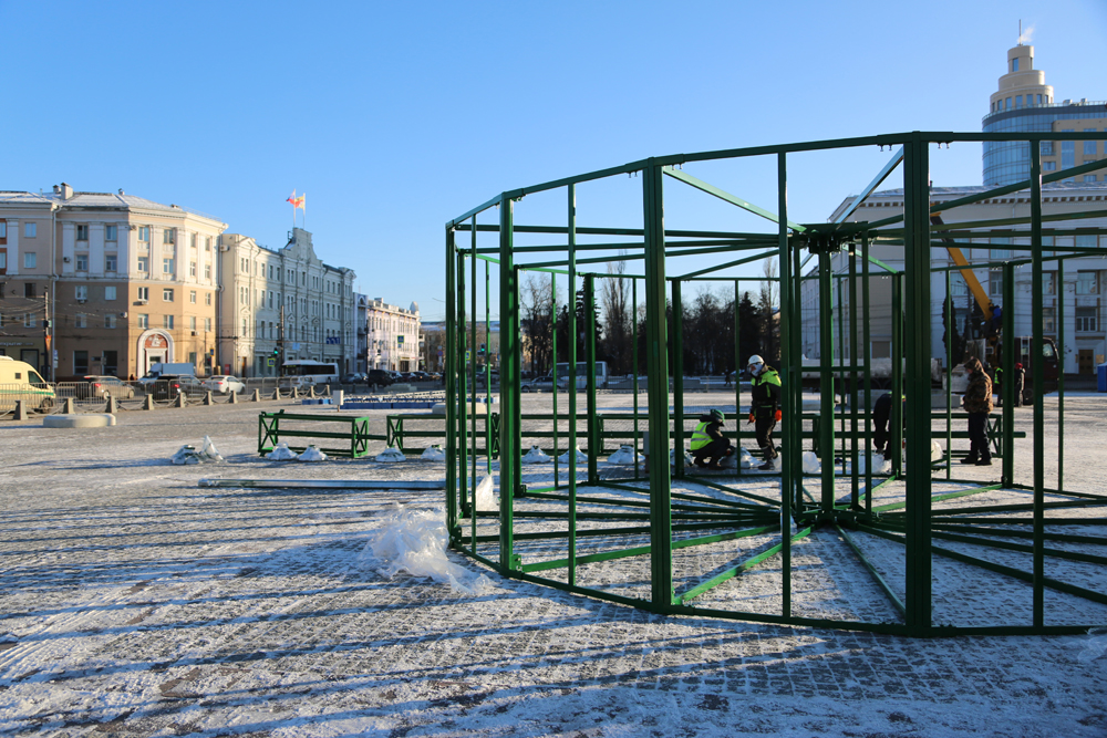 С сегодняшнего дня на площади Ленина подрядчик приступил также к монтажу новогодней елки.