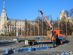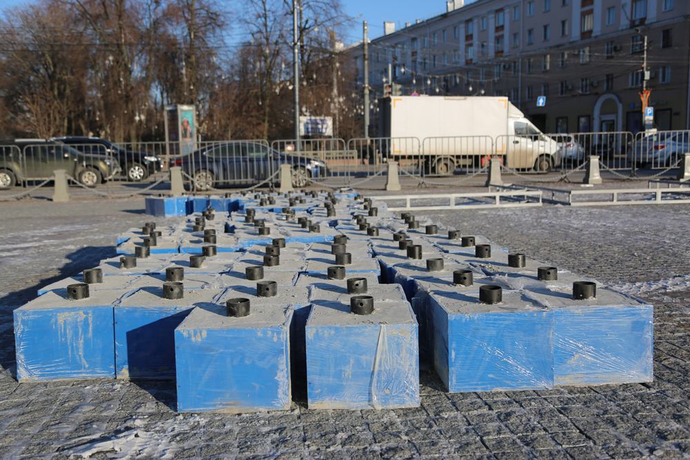 На главной площади города начаты работы по монтажу новогодних конструкций. Четыре дня назад туда начали доставлять элементы, которые необходимы для дальнейшей установки новогодних конструкций. Это 350 тумб-подставок, бетонные конусообразные основания, деревянные пьедесталы и другое оборудование. По словам представителя фирмы-подрядчика Бориса Чубура, сейчас, как на настоящей строительной площадке, идёт подготовка фундамента будущего маленького новогоднего парка, который появится в самом центре города.