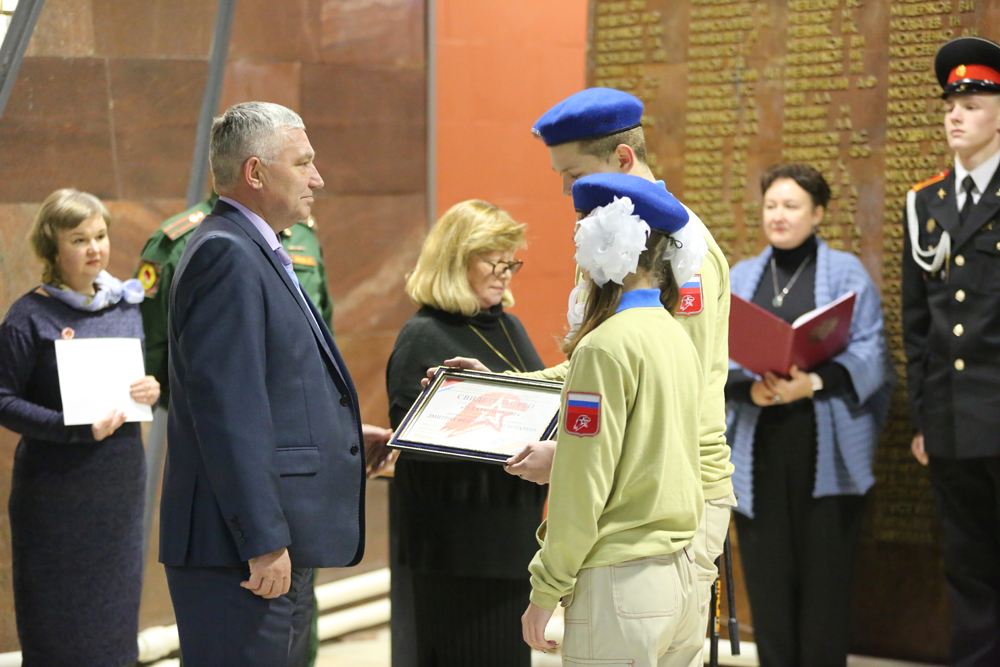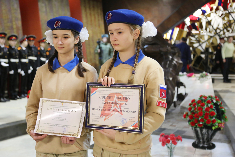 Командиры отрядов получили соответствующие свидетельства из рук Василия Пенькова и Рафката Валиулина. - Хотелось бы, чтобы вы были достойны имен этих замечательных людей, которые ценой своей жизни защищали нашу родину, обеспечили наше с вами будущее и настоящее. Вам есть на кого равняться в этой жизни, пожалуйста, будьте достойны своих героев, - напутствовал ребят Василий Степанович.В свою очередь, Наталья Кармазина поблагодарила ребят за проделанную работу по сохранению памяти о войне и о героях, ковавших победу, и вручила сертификаты на получение комплектов зимней юнармейской формы.