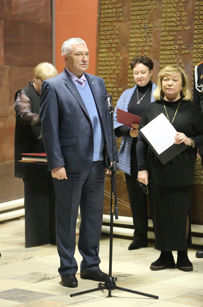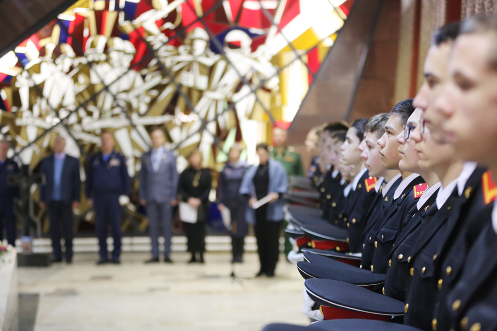 Началось мероприятие на площадке перед мемориальный комплексом – здесь ребята возложили венки и цветы к памятнику «Клятва-салют» и братской могиле. Далее действие перенеслось в Зал Памяти.