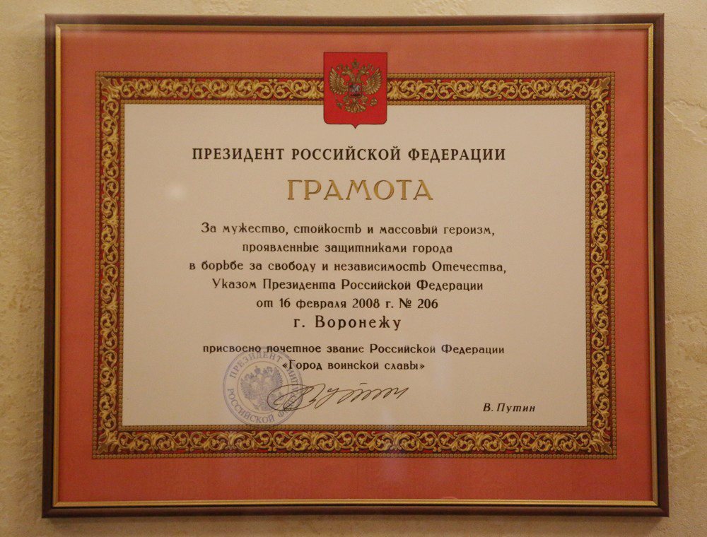 От всей души поздравляем ныне здравствующих ветеранов – Митрофана Москалева, Василия Карнушина, Антонину Гавриленко, Ивана Осадчука, Анну Кондратьевну, Алексея Альпакова, Владимира Нежельских, Ивана Писарева, которые участвовали в освобождении, разминировании и восстановлении Воронежа. Безусловно, статус города воинской славы – это их высокая и справедливая награда, также как и их боевых товарищей - воронежцев - ополченцев и бойцов Красной армии, отстоявших наш родной город.