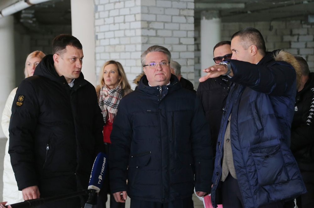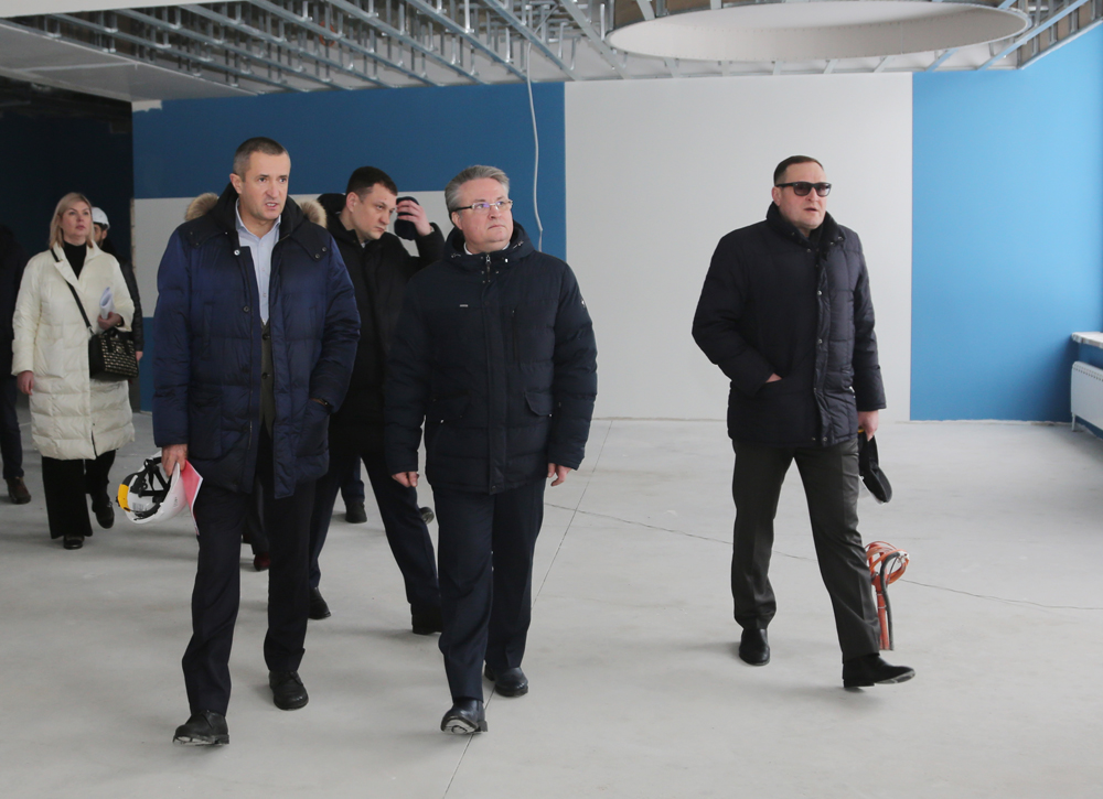 15.02.2023 Мэр с очередным инспекционным выездом посетил сегодня, 15 февраля, строящуюся мегашколу.Вместе с ним оценить ход работ приехали и.о. заместителей главы администрации по градостроительству и социальной политике Александр Головацкий и Любовь Кулакова, руководитель управления строительной политики Игорь Добрынин.