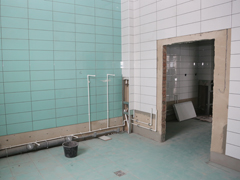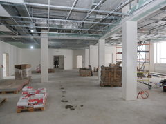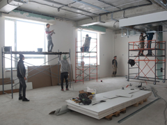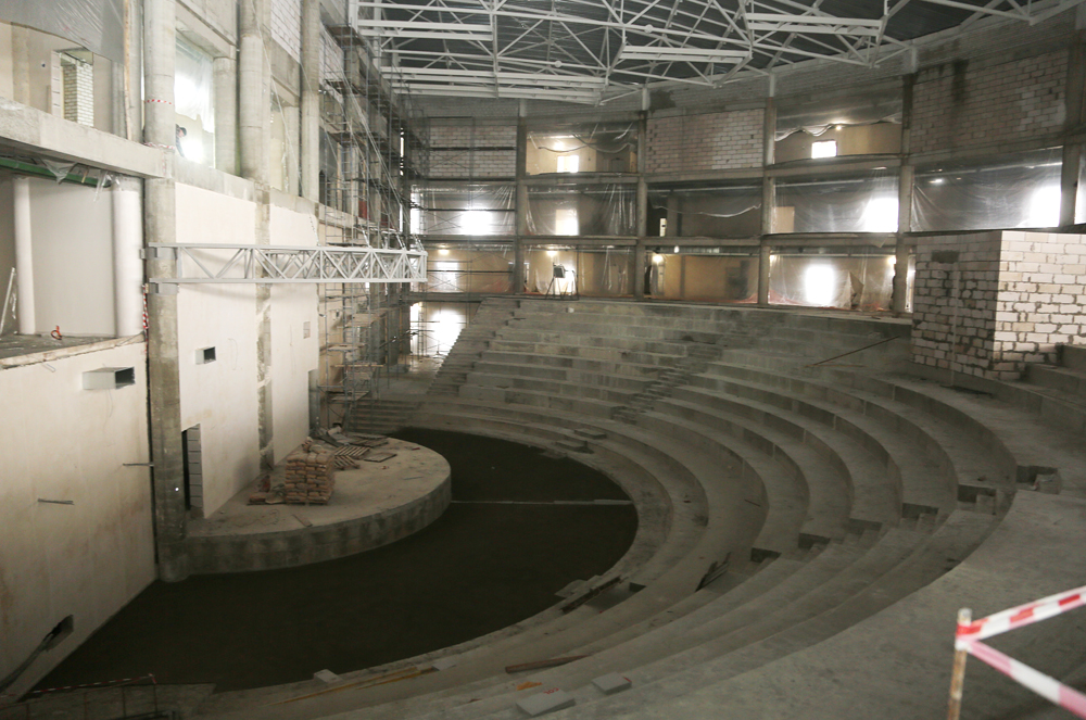 В большом блоке, это уже локация среднего и старшего звена, осмотрели рекреации, инженерный зал и амфитеатр – здесь уже приступают к монтажу потолка, который находится на уровне четвертого этажа здания, после чего будут выставлены леса для оштукатуривания стен.