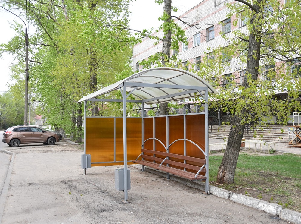 На остановке в Сомово, также пользующейся популярностью у горожан, обновили лакокрасочное покрытие металлического каркаса павильона, лавочки, а также заменили поликарбонат на крыше и стенках.
