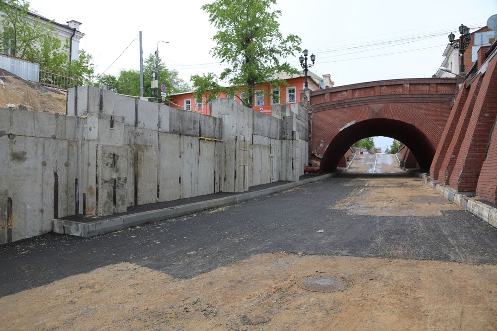 Хотя сама стена – новодел, но наряду с другими элементами составляет архитектурно-пространственную композицию Каменного моста, как памятника архитектуры. В связи с этим работать требовалось скрупулезно, под контролем специалистов из областного управления по охране объектов культурного наследия. Поэтому и потребовалось столько времени. Сейчас в основании возведенной двадцати четырёх метровой подпорной стены забетонированы 32 сваи, смонтирован монолитный ростверк, который теперь будет равномерно распределять нагрузку от бокового давления грунта.