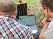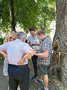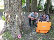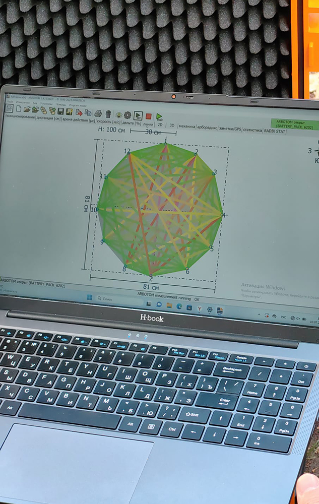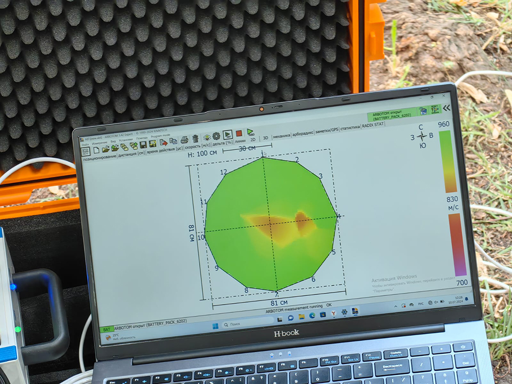 Он подробно объяснил принцип действия арботома, продемонстрировал ход работы на практике и провел диагностику тополя в парке имени Бунина. В процессе обследования оператор установил датчики по периметру дерева, подключил их к компьютеру и произвел последовательные удары по каждому датчику. Результаты исследования, требующие оценки и распознавания данных, отобразились в специальной компьютерной программе.