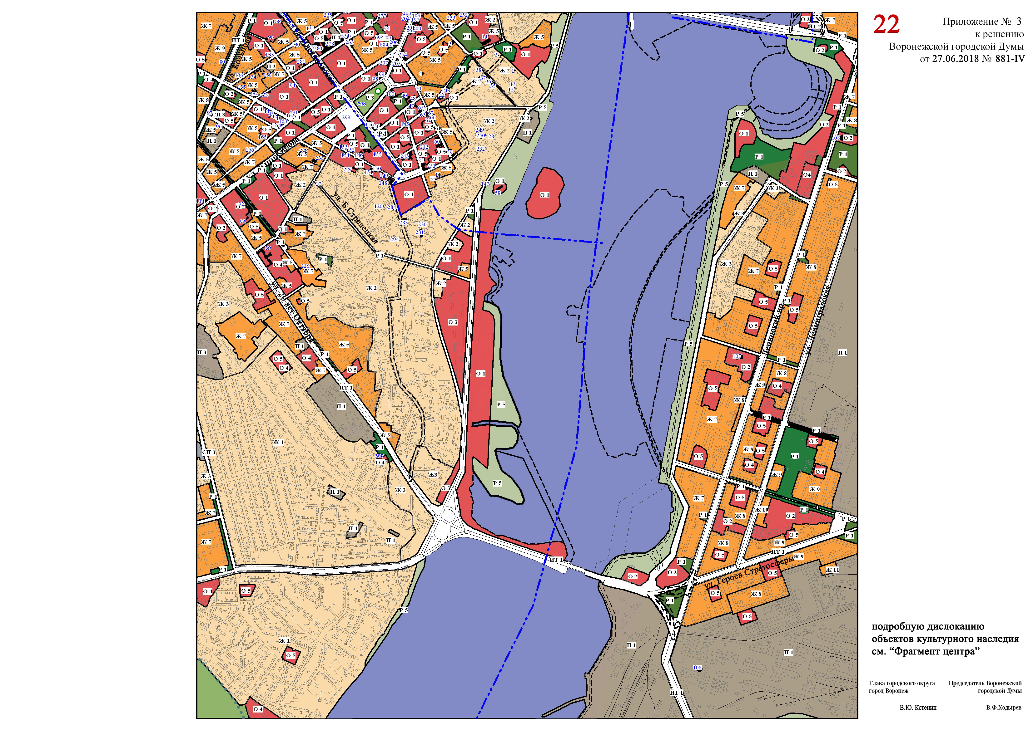 2. Внести изменение в приложение к решению Воронежской городской Думы от 25.12.2009 № 384-II «Об утверждении Правил землепользования и застройки городского округа город Воронеж», изложив в статье 17 «Карта градостроительного зонирования» лист 22 и лист «Фрагмент центральной части» в новой редакции согласно приложениям № 3, 4.