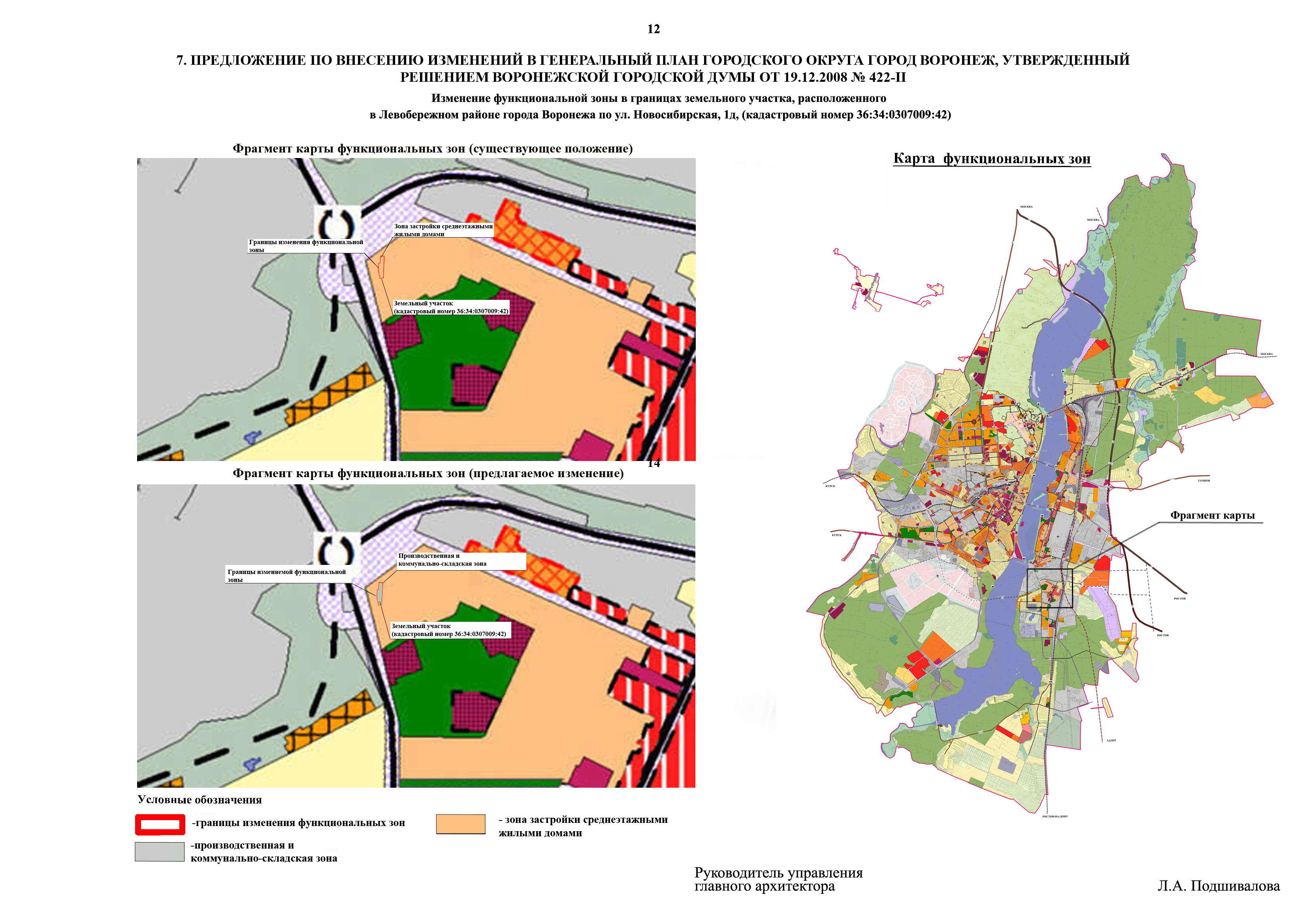 - по проекту внесения изменений в Генеральный план городского округа город Воронеж в части изменения функциональной зоны застройки среднеэтажными жилыми домами (4-8 этажей) на производственную и коммунально-складскую зону для земельного участка по ул. Новосибирская, 1д (кадастровый номер 36:34:0307009:42);