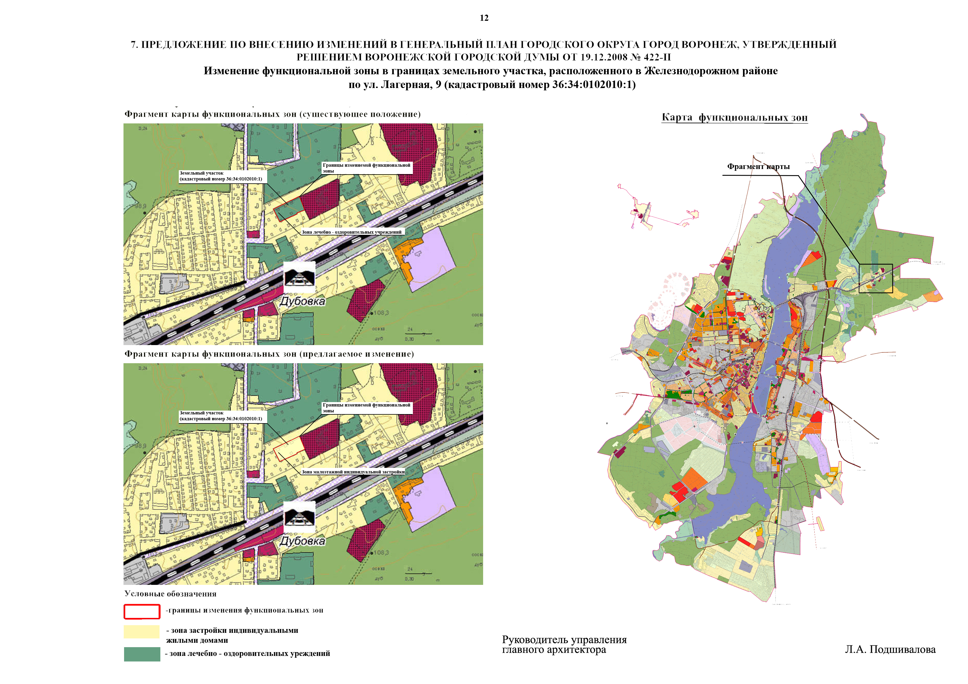 - по проекту внесения изменений в Генеральный план городского округа город Воронеж в части изменения функциональной зоны лечебно-оздоровительных учреждений на зону застройки индивидуальными жилыми домами (до трех этажей) для земельного участка по ул. Лагерная, 9 (кадастровый номер 36:34:0102010:1);