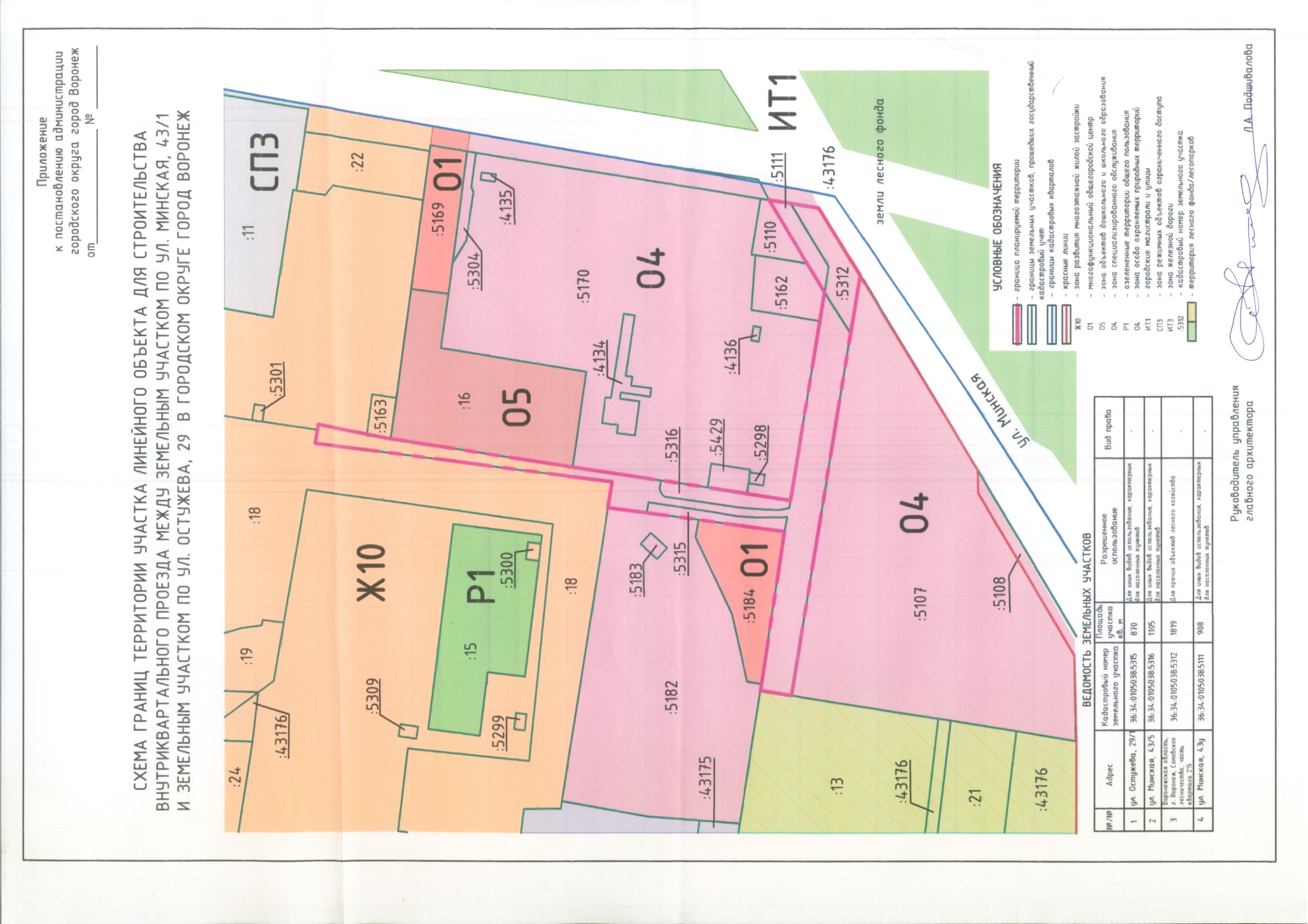 2.1. Подготовить в соответствии с утвержденным заданием документацию по планировке территории участка линейного объекта для строительства внутриквартального проезда между земельным участком по ул. Минская, 43/1 и земельным участком по ул. Остужева, 29 в городском округе город Воронеж согласно прилагаемой схеме.