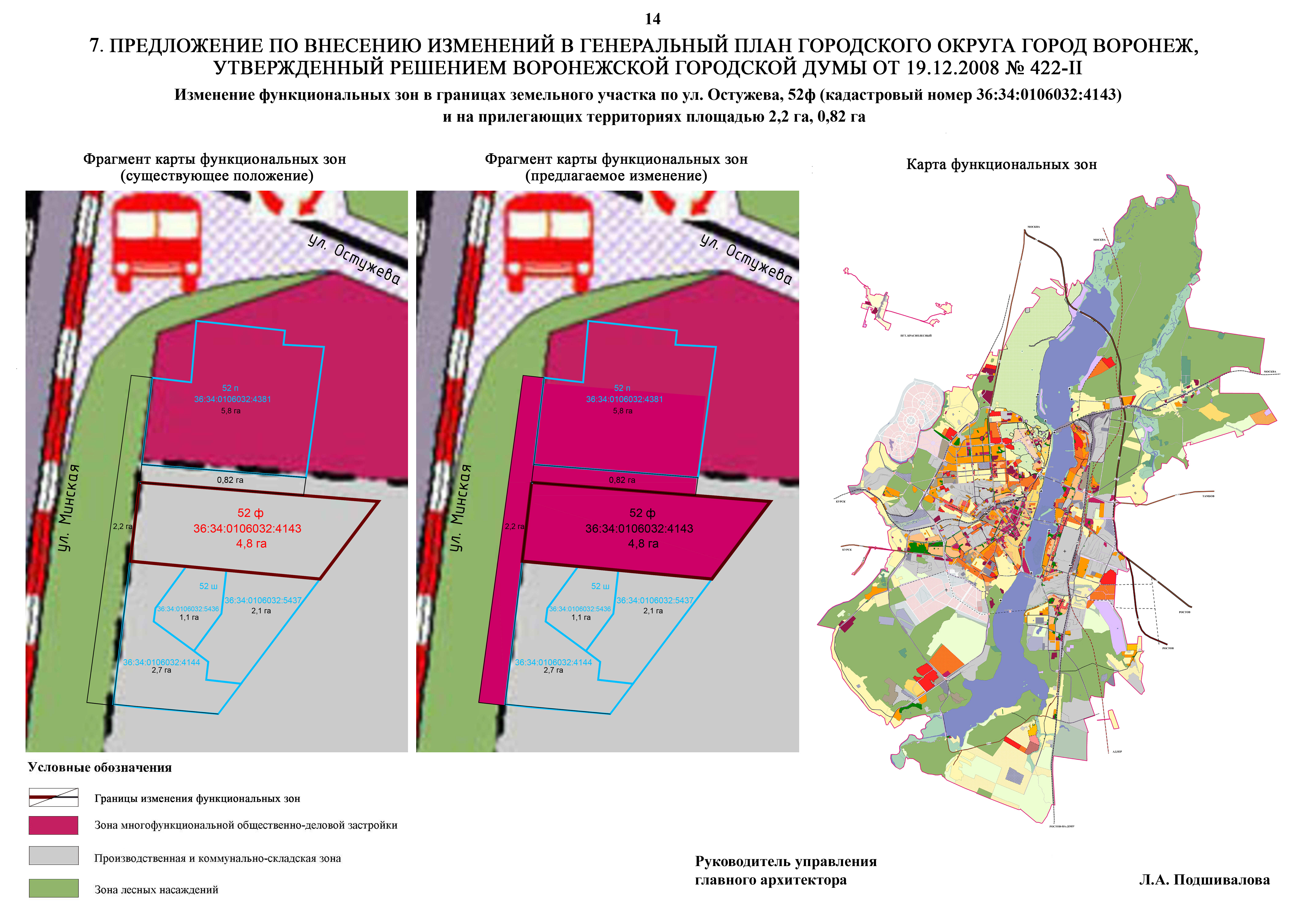 - по проекту внесения изменений в Генеральный план городского округа город Воронеж в части изменения функциональной производственной и коммунально-складской зоны (до 2020 года) на зону многофункциональной общественно-деловой застройки для земельного участка по ул. Остужева, 52ф (кадастровый номер 36:34:0106032:4143) и прилегающей территории площадью 0,82 га, а также в части изменения функциональной зоны лесных насаждений на зону многофункциональной общественно-деловой застройки для прилегающей территории площадью 2,2 га;