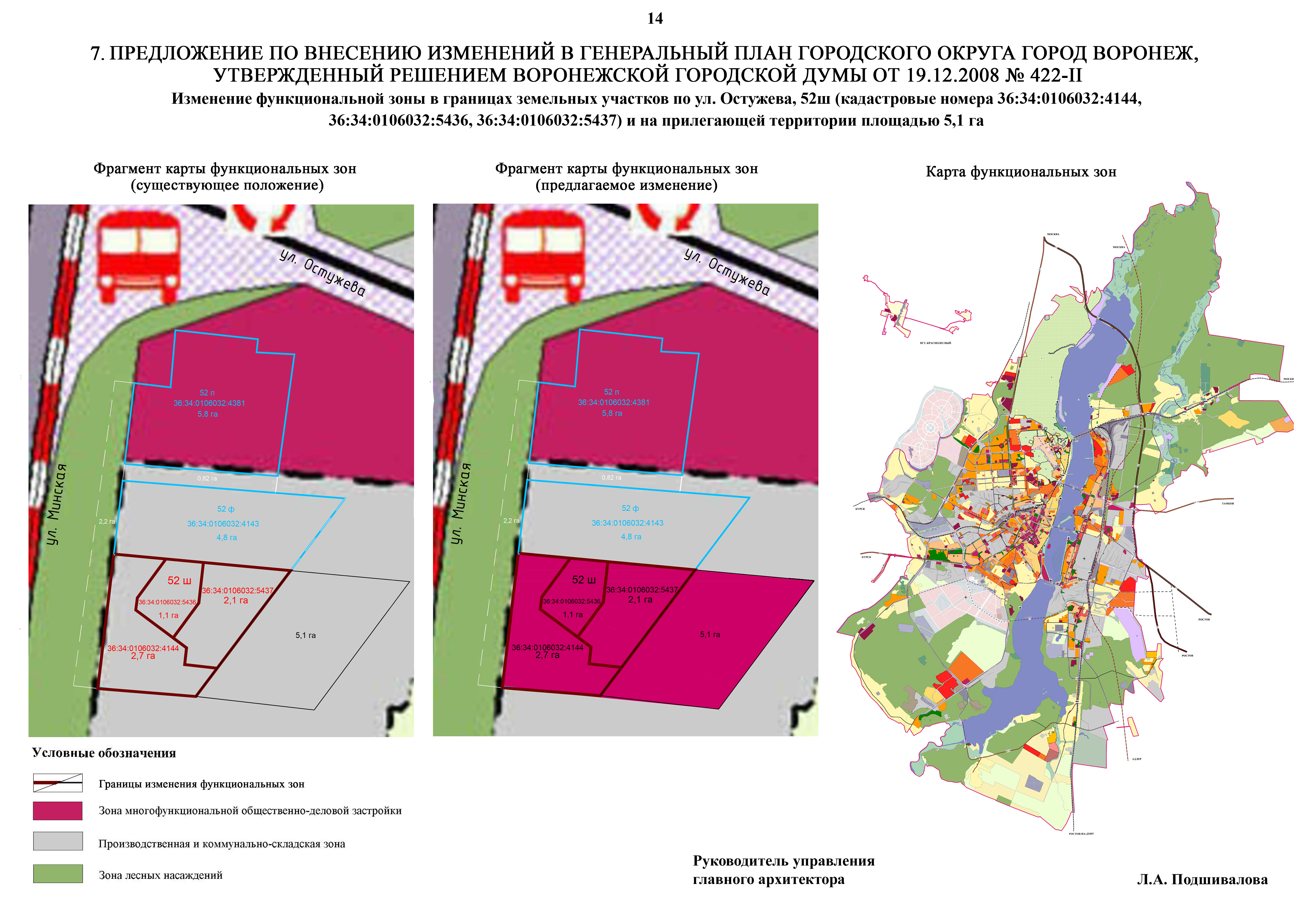 - - по проекту внесения изменений в Генеральный план городского округа город Воронеж в части изменения функциональной производственной и коммунально-складской зоны (до 2020 года) на зону многофункциональной общественно-деловой застройки для земельных участков по ул. Остужева, 52ш (кадастровые номера 36:34:0106032:4144, 36:34:0106032:5436, 36:34:0106032:5437) и прилегающей территории площадью 5,1 га;