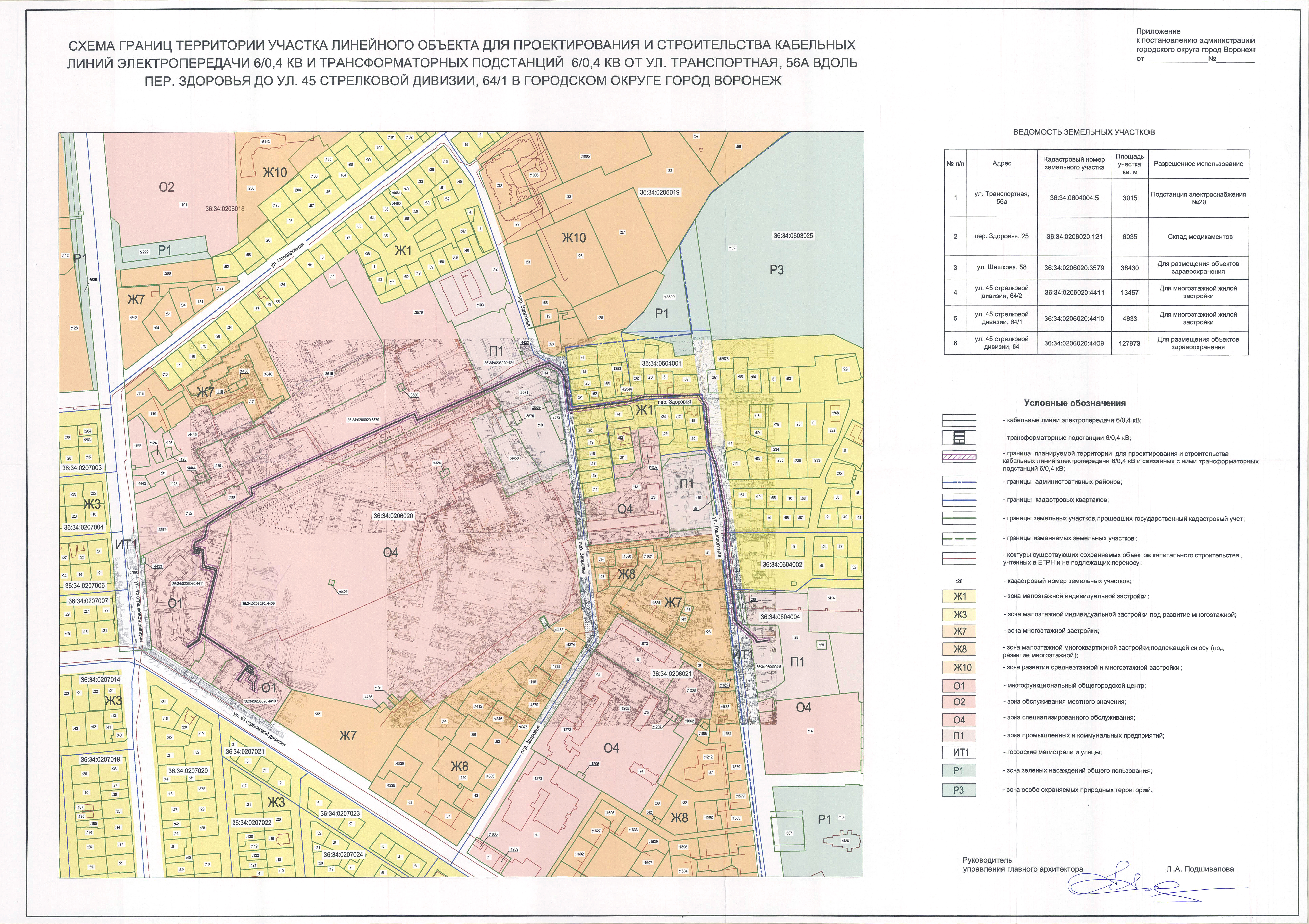 2.1. Подготовить в соответствии с утвержденным заданием документацию по планировке территории участка линейного объекта для проектирования и строительства кабельных линий электропередачи 6/0,4 кВ и трансформаторных подстанций 6/0,4 кВ от ул. Транспортная, 56а вдоль пер. Здоровья до ул. 45 стрелковой дивизии, 64/1 в городском округе город Воронеж согласно прилагаемой схеме.