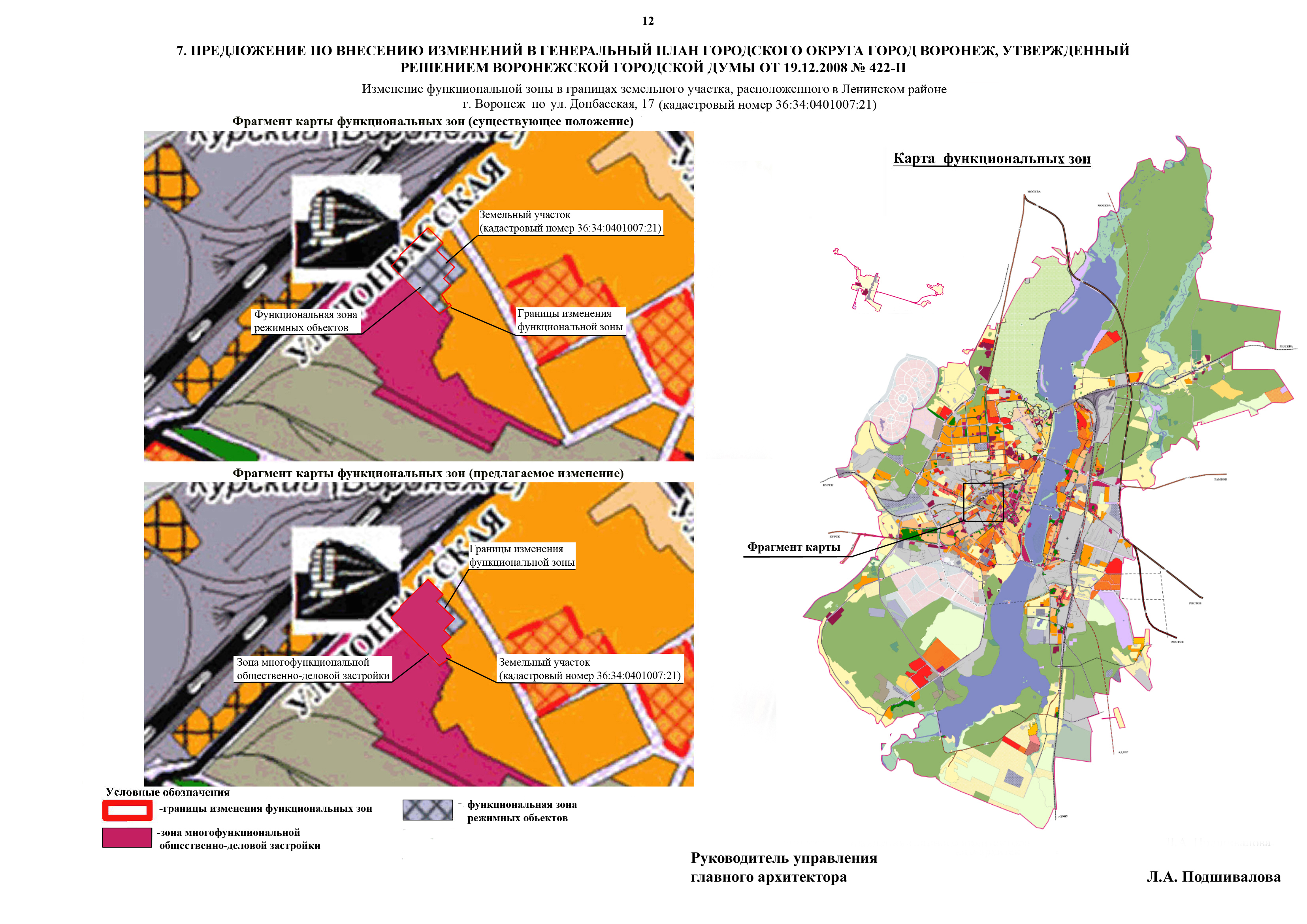 - - по проекту внесения изменений в Генеральный план городского округа город Воронеж в части изменения функциональной зоны режимных объектов на зону многофункциональной общественно-деловой застройки для земельного участка по ул. Донбасская, 17 (кадастровый номер 36:34:0401007:21);