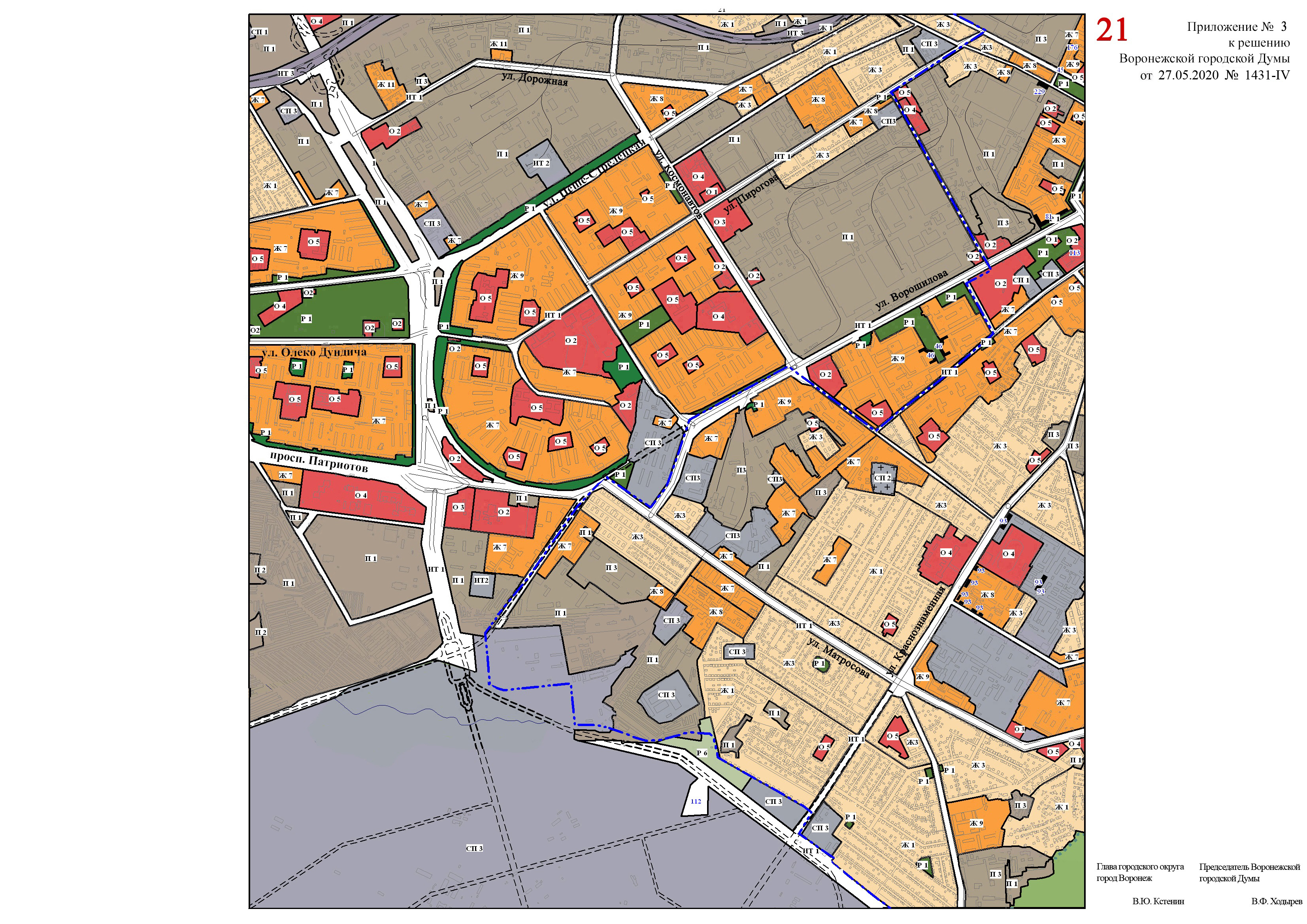 2. Внести изменение в приложение к решению Воронежской городской Думы от 25.12.2009 № 384-II «Об утверждении Правил землепользования и застройки городского округа город Воронеж», изложив в статье 17 «Карта градостроительного зонирования» лист 21 в новой редакции согласно приложению № 3.