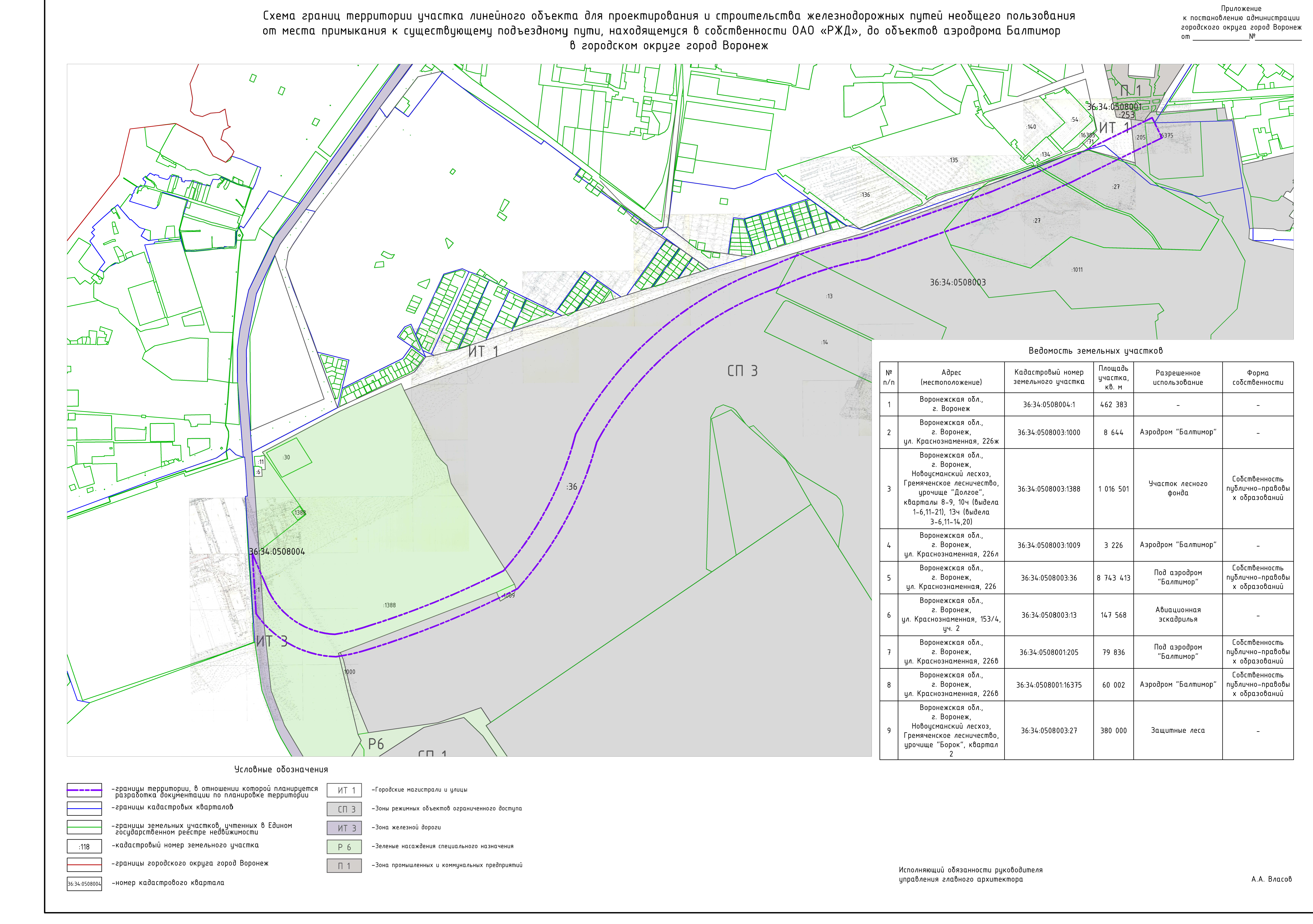Схема границ территории участка линейного объекта для проектирования и строительства железнодорожных путей необщего пользования от места примыкания к существующему подъездному пути, находящемуся в собственности ОАО «РЖД», до объектов аэродрома Балтимор в городском округе город Воронеж