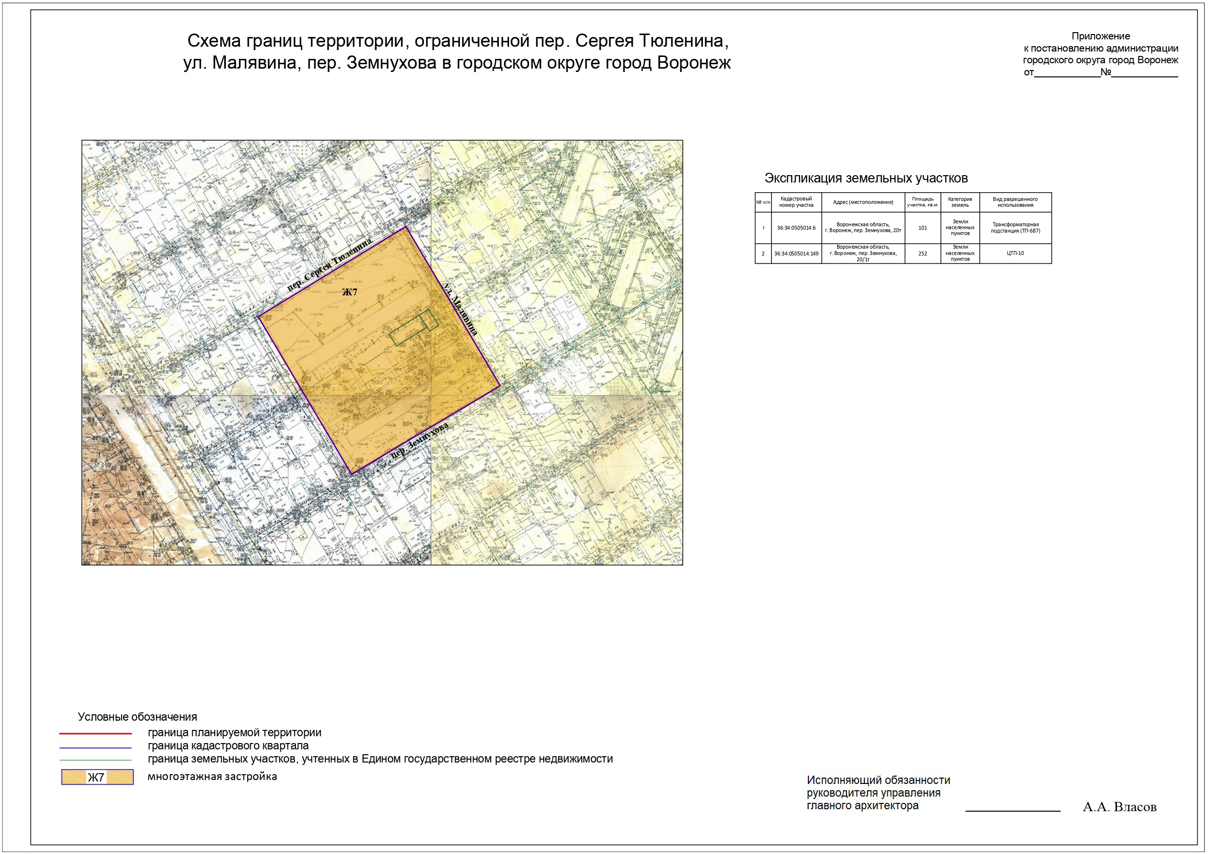 Схема границ территории, ограниченной пер. Сергея Тюленина, ул. Малявина, пер. Земнухова в городском округе город Воронеж