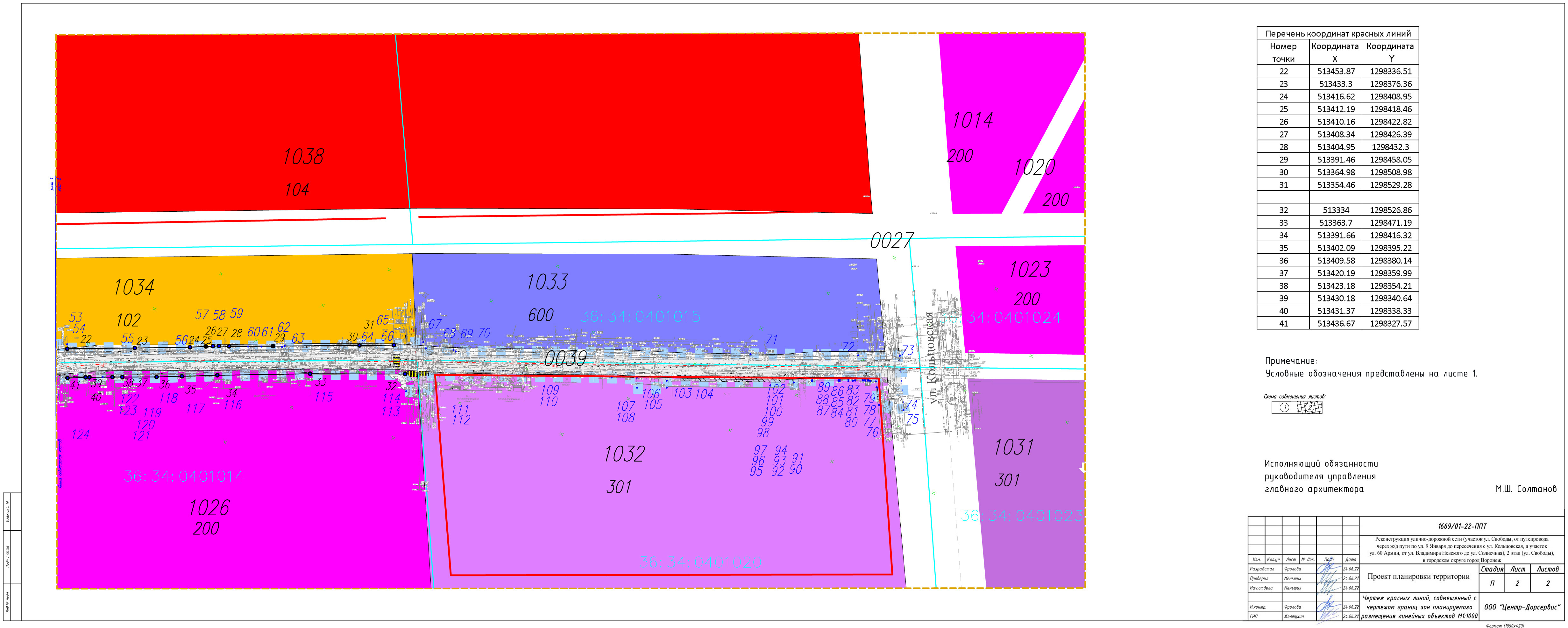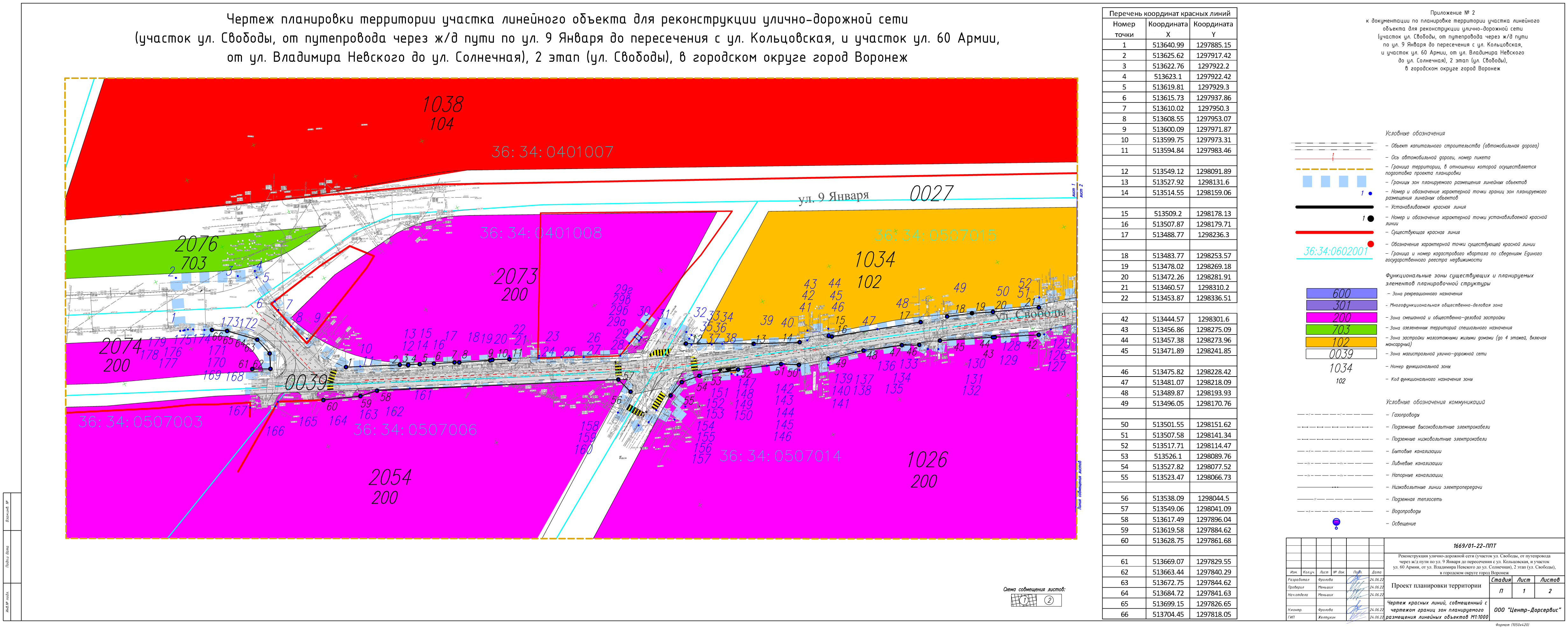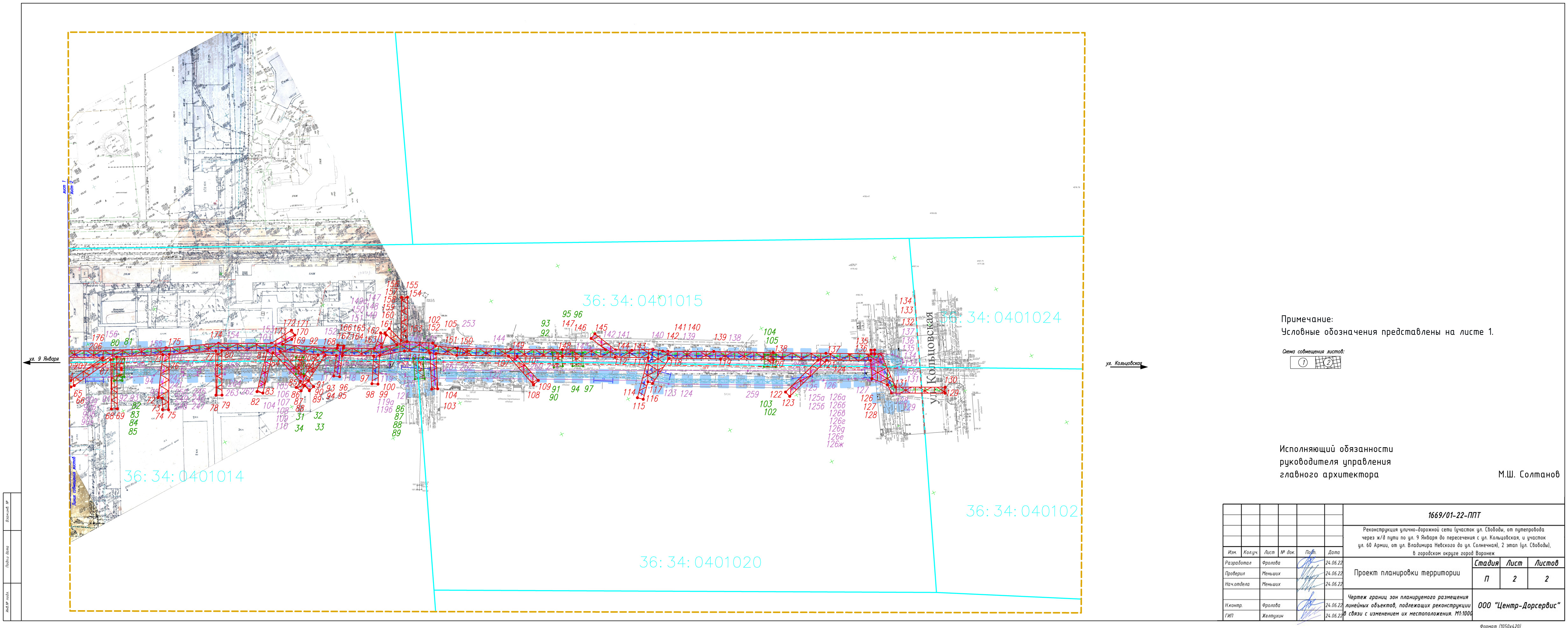 Чертеж планировки территории участка линейного объекта для реконструкции улично-дорожной сети (участок ул. Свободы, от путепровода через ж/д пути по ул. 9 Января до пересечения с ул. Кольцовская, и участок ул. 60 Армии, от ул. Владимира Невского до ул. Солнечная), 2 этап (ул. Свободы), в городском округе город Воронеж. (лист 2)