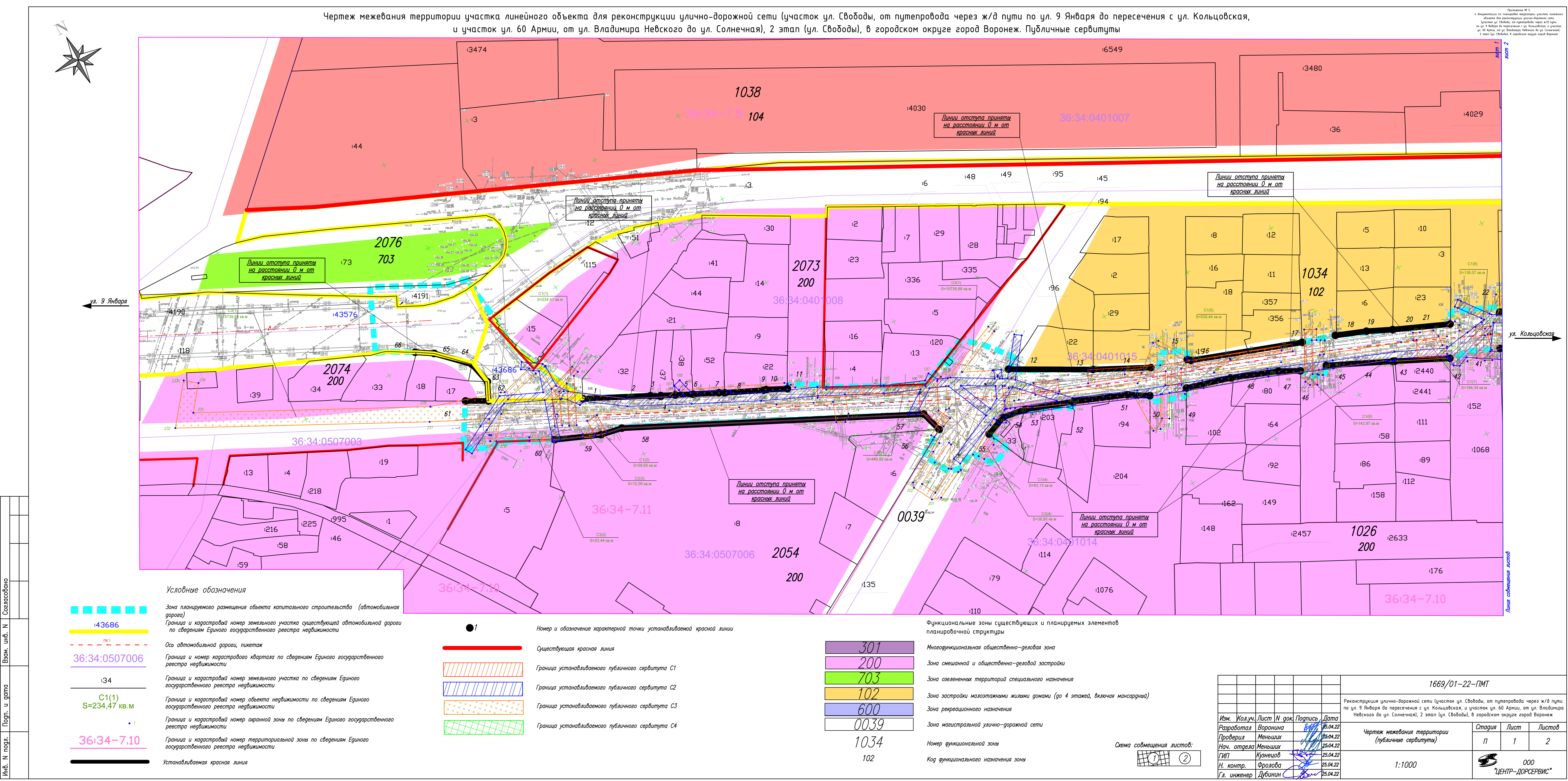 Чертеж межевания территории участка линейного объекта для реконструкции улично-дорожной сети (участок ул. Свободы, от путепровода через ж/д пути по ул. 9 Января до пересечения с ул. Кольцовская, и участок ул. 60 Армии, от ул. Владимира Невского до ул. Солнечная), 2 этап (ул. Свободы), в городском округе город Воронеж. Публичные сервитуты (лист 1)