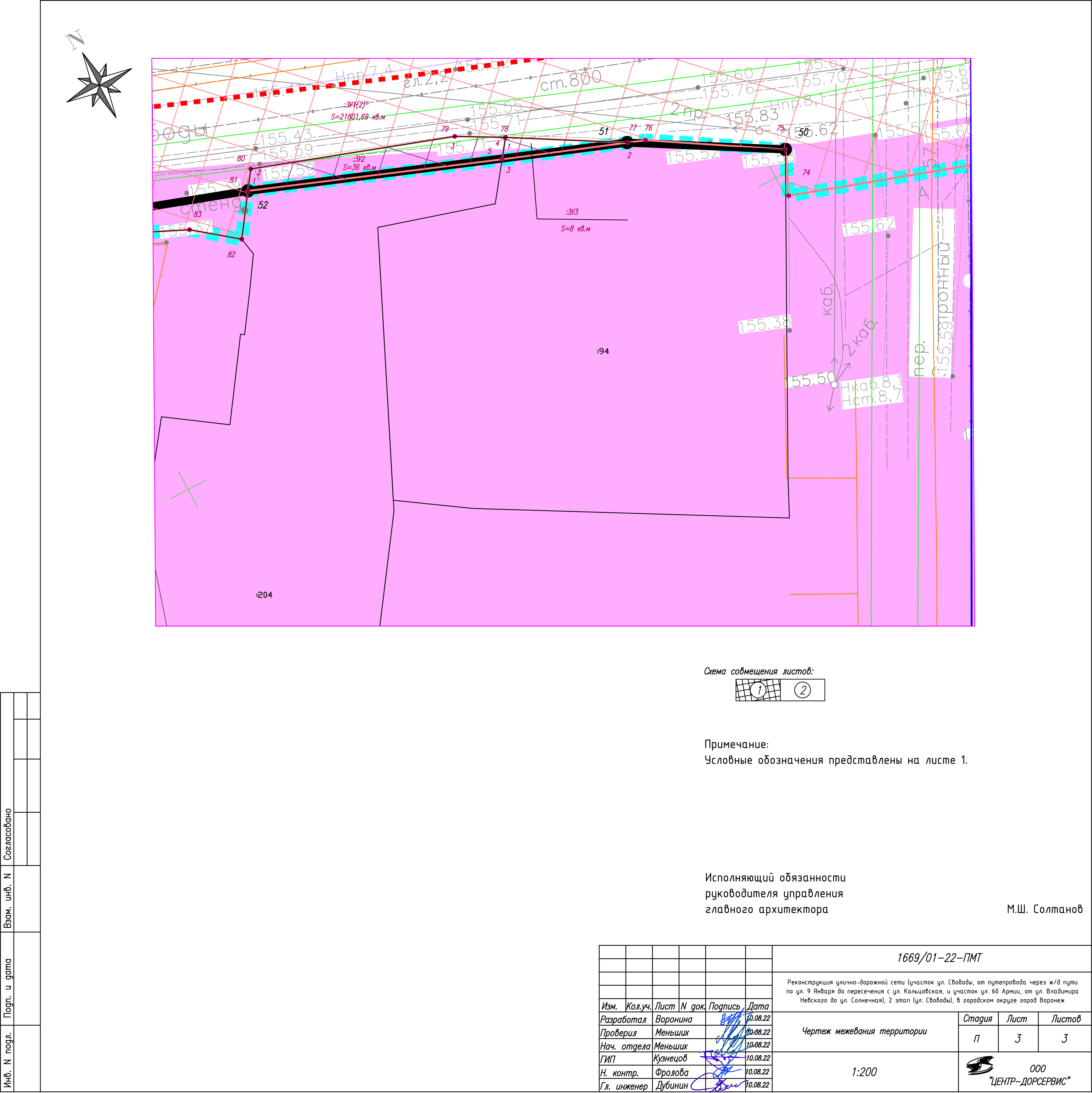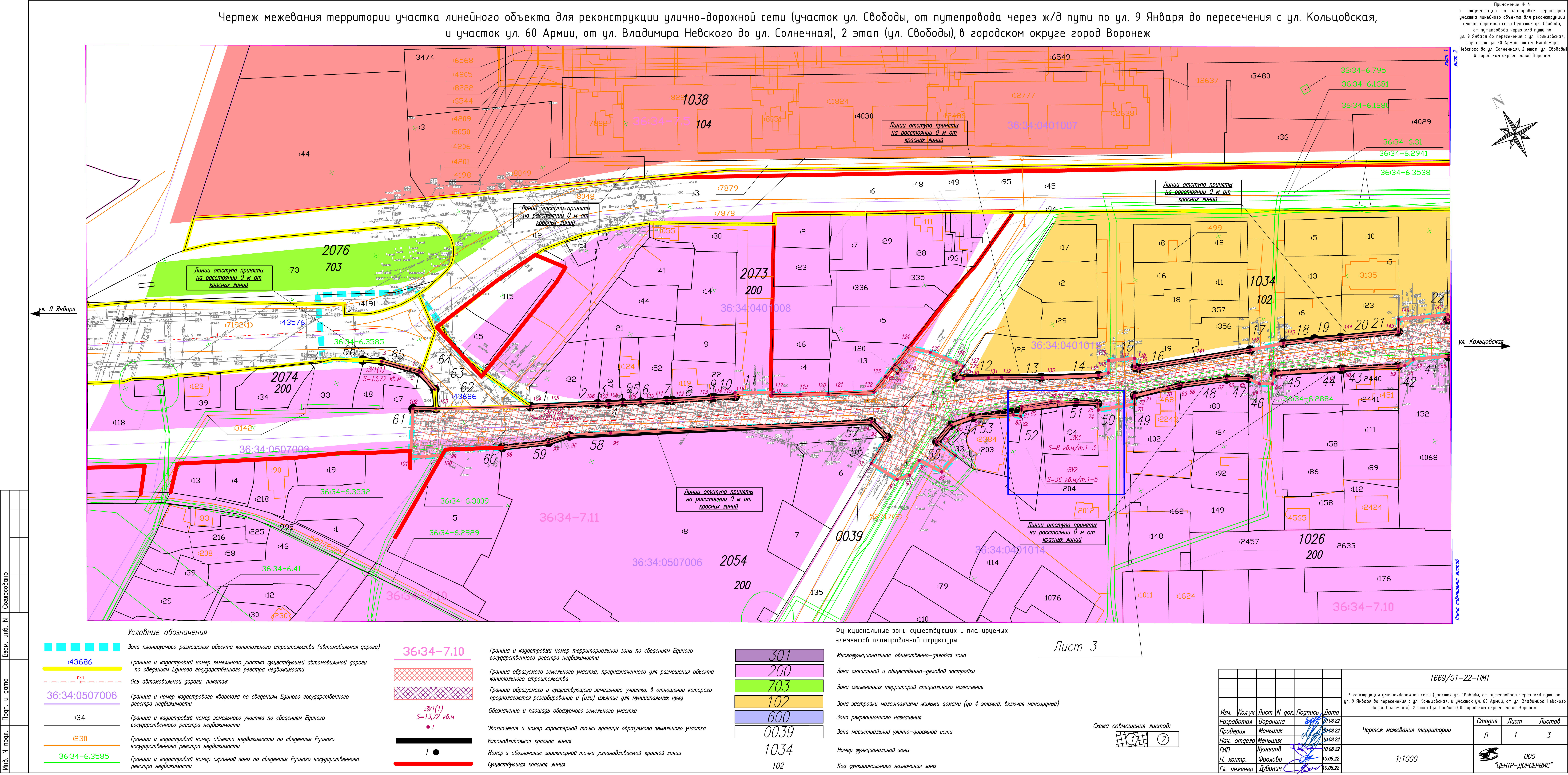 Чертеж межевания территории участка линейного объекта для реконструкции улично-дорожной сети (участок ул. Свободы, от путепровода через ж/д пути по ул. 9 Января до пересечения с ул. Кольцовская, и участок ул. 60 Армии, от ул. Владимира Невского до ул. Солнечная), 2 этап (ул. Свободы), в городском округе город Воронеж. (лист 1)