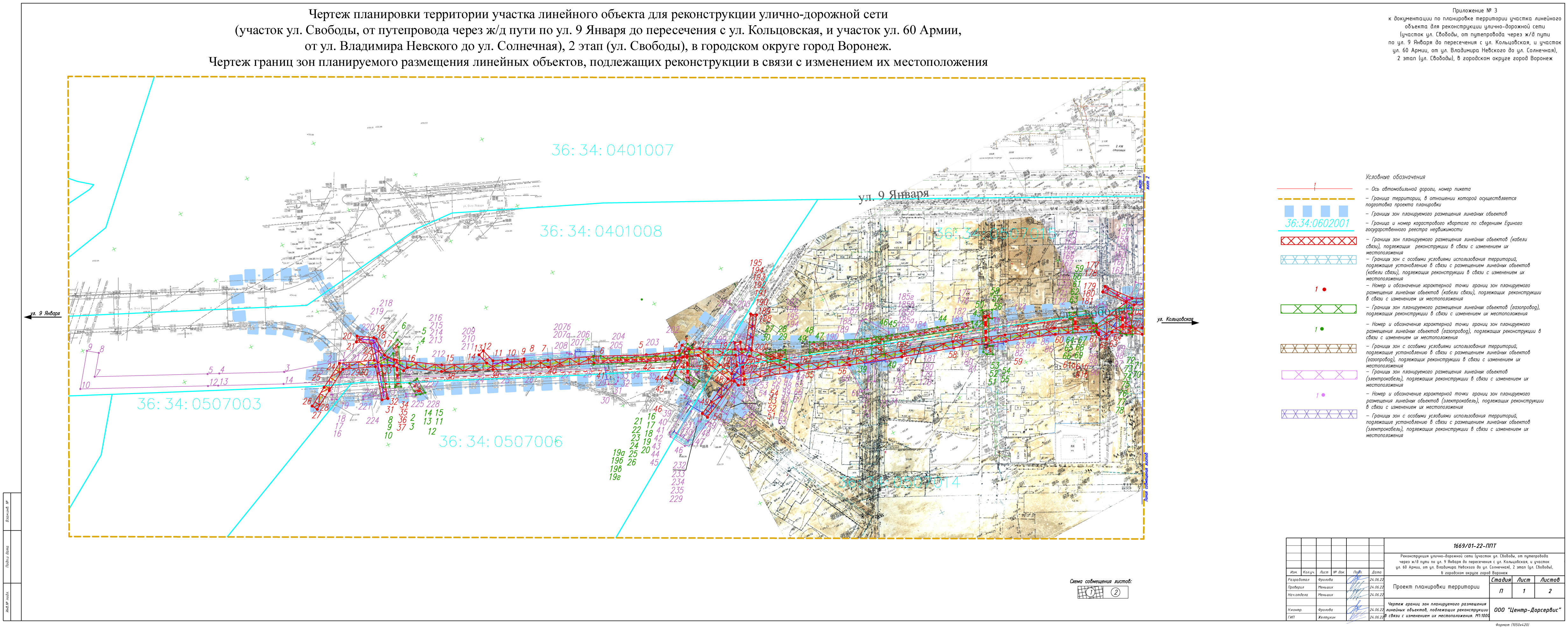 Чертеж планировки территории участка линейного объекта для реконструкции улично-дорожной сети (участок ул. Свободы, от путепровода через ж/д пути по ул. 9 Января до пересечения с ул. Кольцовская, и участок ул. 60 Армии, от ул. Владимира Невского до ул. Солнечная), 2 этап (ул. Свободы), в городском округе город Воронеж. (лист 1)