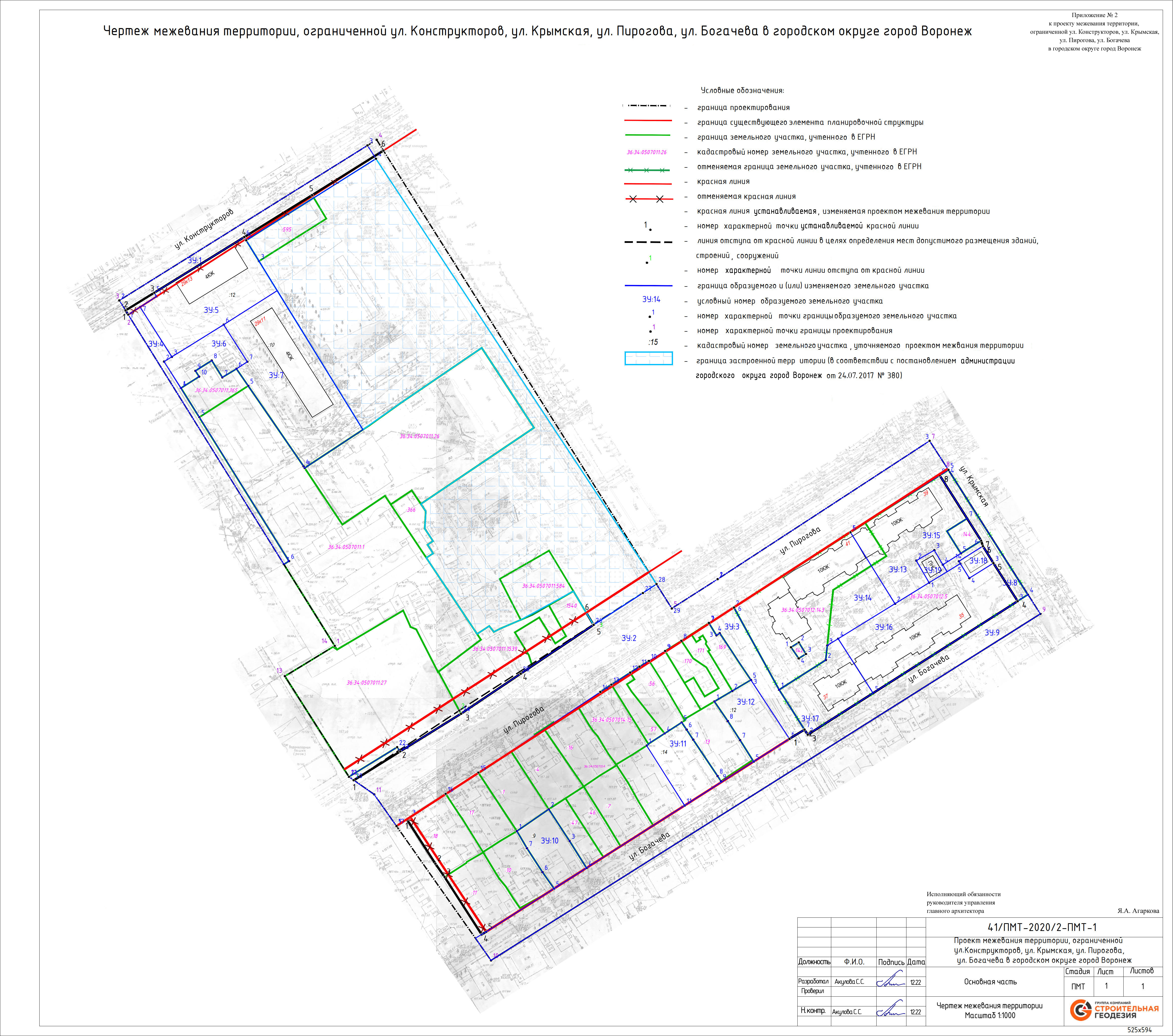 Чертеж межевания территории, ограниченной ул. Конструкторов, ул. Крымская, ул. Пирогова, ул. Богачева в городском округе город Воронеж