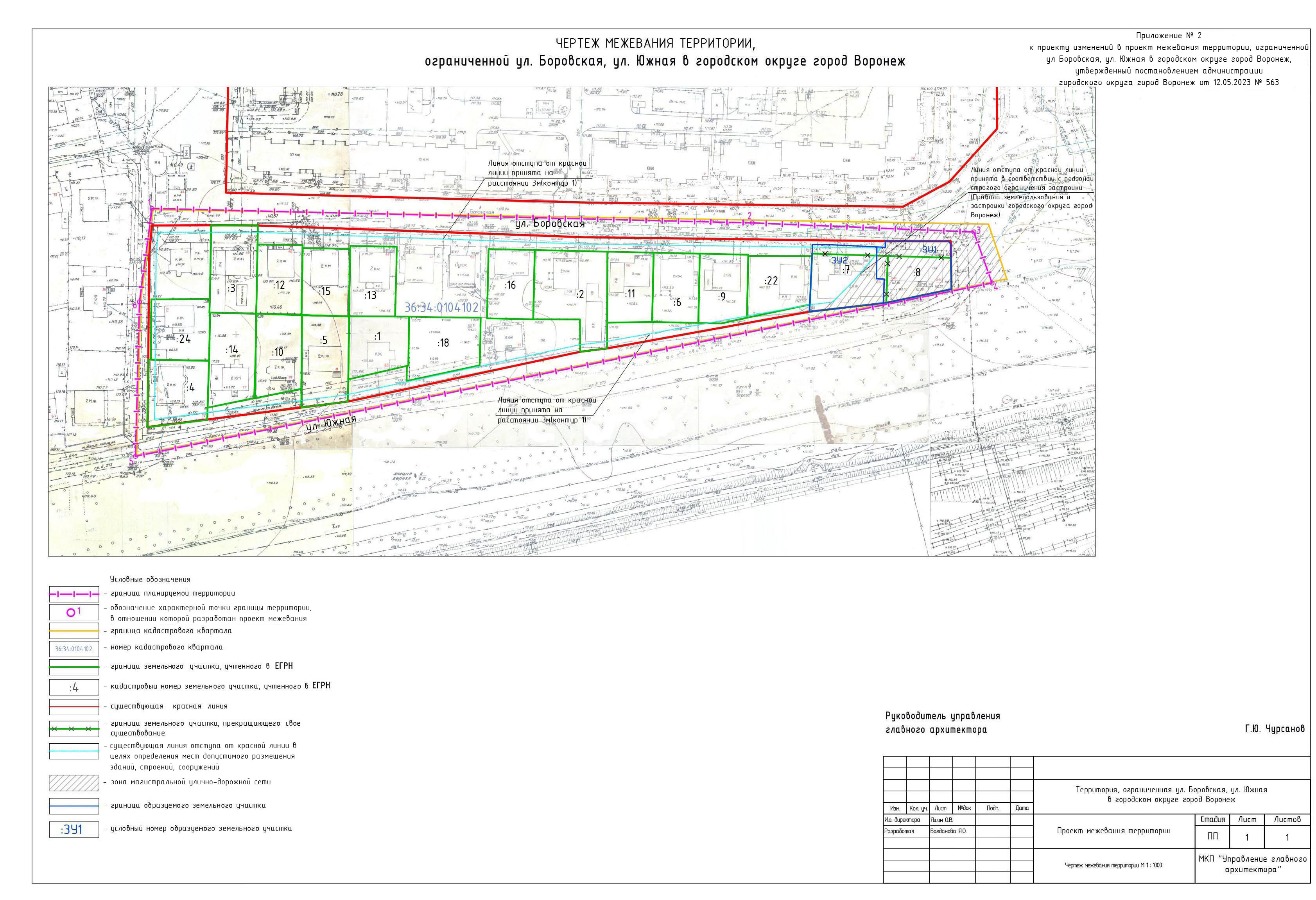 Проект изменений в проект межевания территории, ограниченной ул. Боровская, ул. Южная в городском округе город Воронеж, утвержденный постановлением администрации городского округа город Воронеж от 12.05.2023 № 563